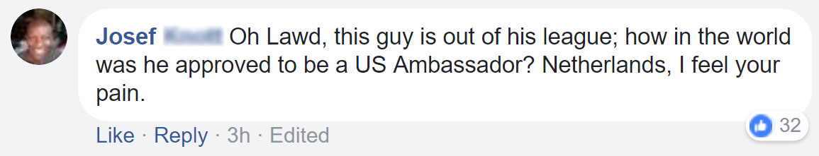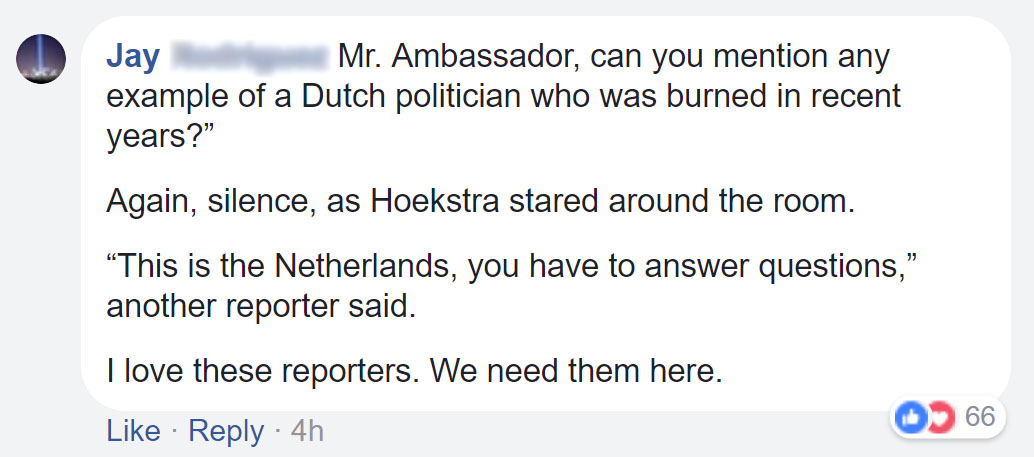 Donald Trump finally sent his new ambassador to the Netherlands. The man is called Pete Hoekstra, and back in December he went viral after a Dutch journalist confronted him with his own lies. Back in 2015 Hoekstra claimed that because of Islamic influences in the Netherlands resulted in ‘no-go zones’ and that politicians were set on fire (you read that right). On Thursday he gave a press conference for the Dutch press, who had some burning questions for him…
