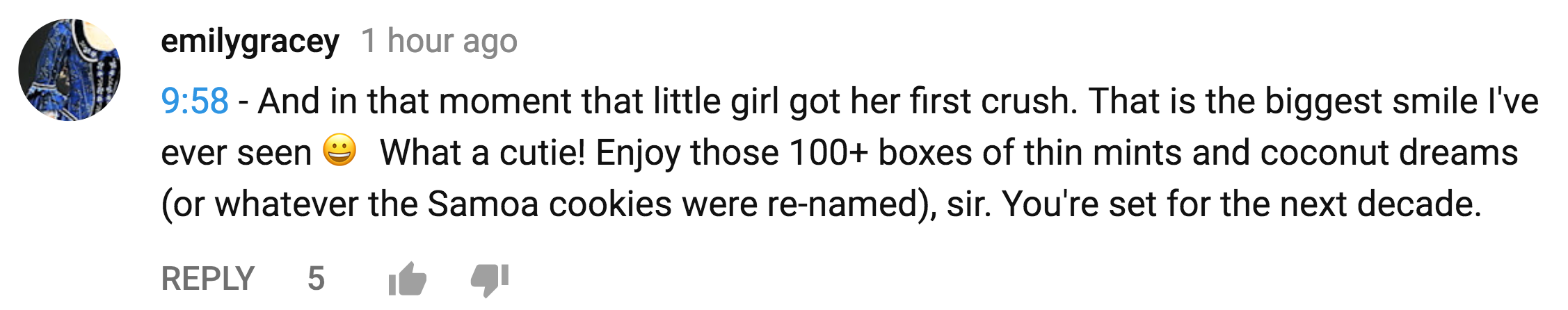 It’s Girl Scout Cookie season in the United States. Girl Scouts from all over the country try to sell people cookies to raise money. They try all kinds of creative methods to get people to buy from them. Six year-old Charity Joy from Georgia went viral with her cookie-inspired version of Childish Gambino’s ‘Redbone’. Thanks to Stephen Colbert, she was able to meet her idol, leading to adorable television.