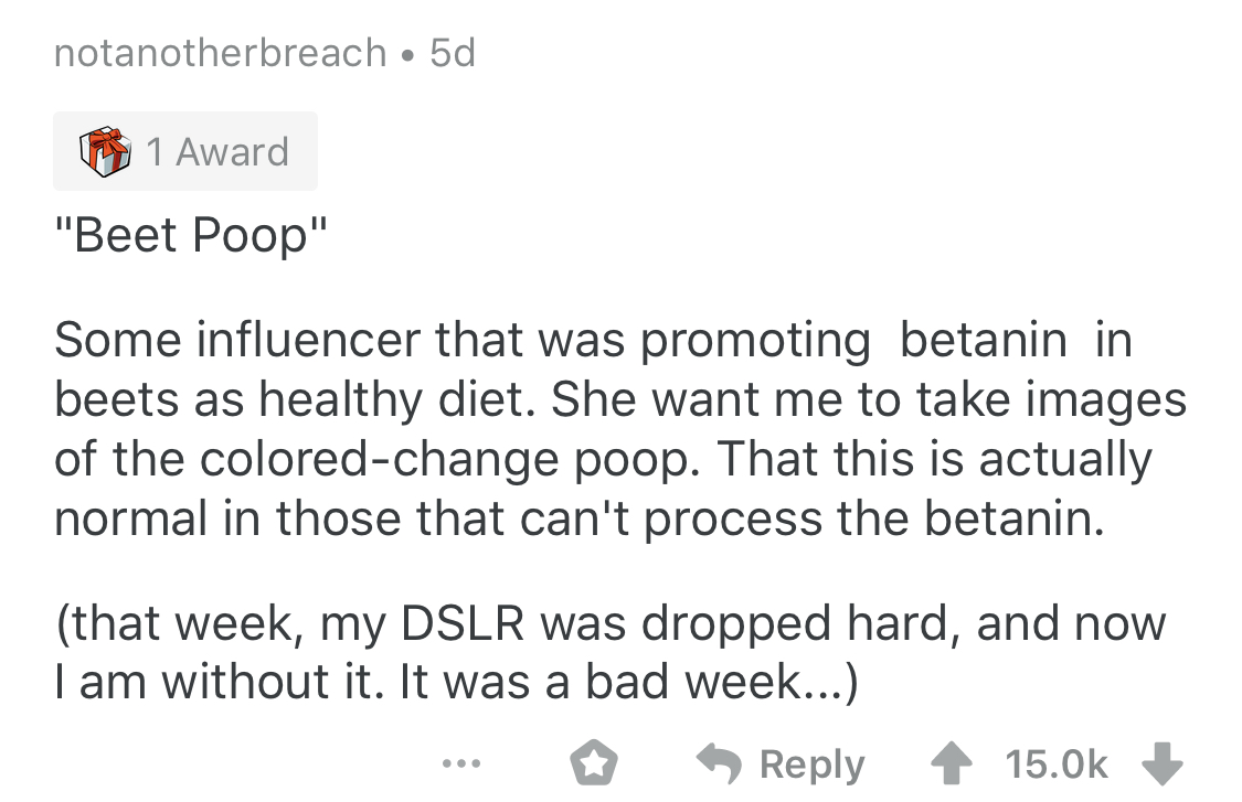 6. Ein Influencer, der den Farbstoff Betanin in Rüben als gesunde Diät vermarkten wollte, stellte einmal die Anfrage, ein Shooting von farblich verändertem Stuhlgang zu machen.