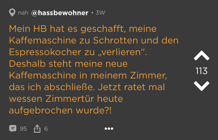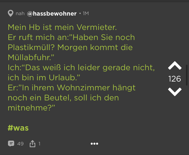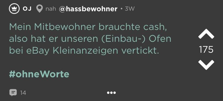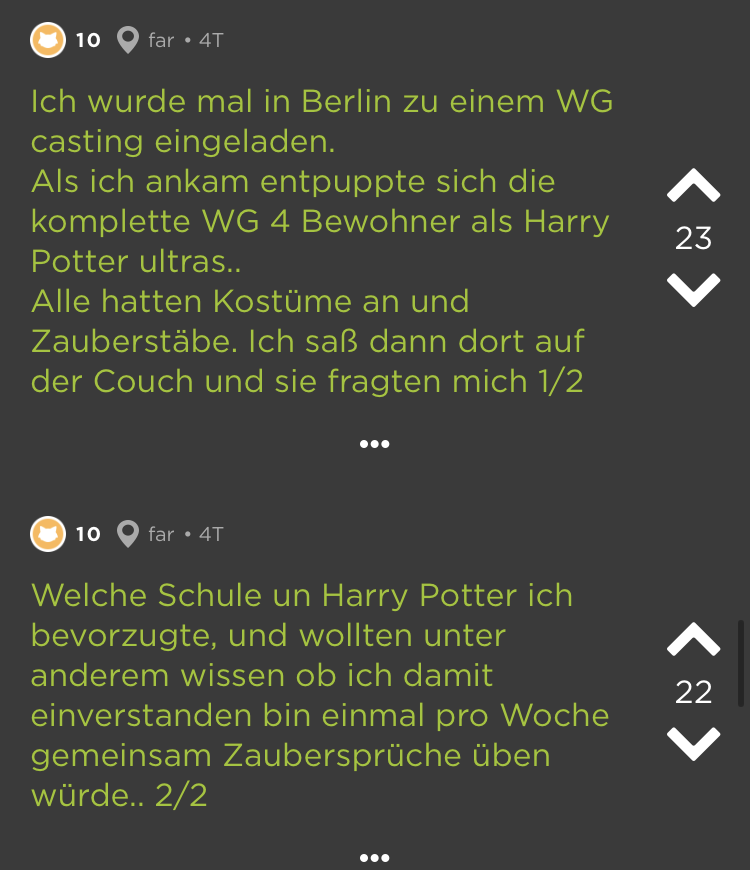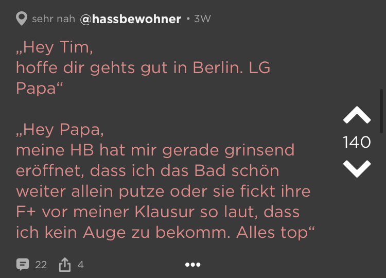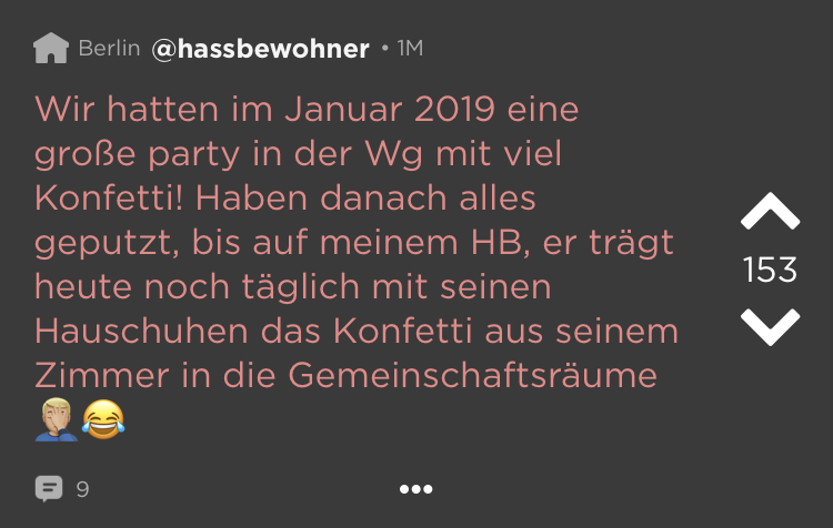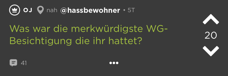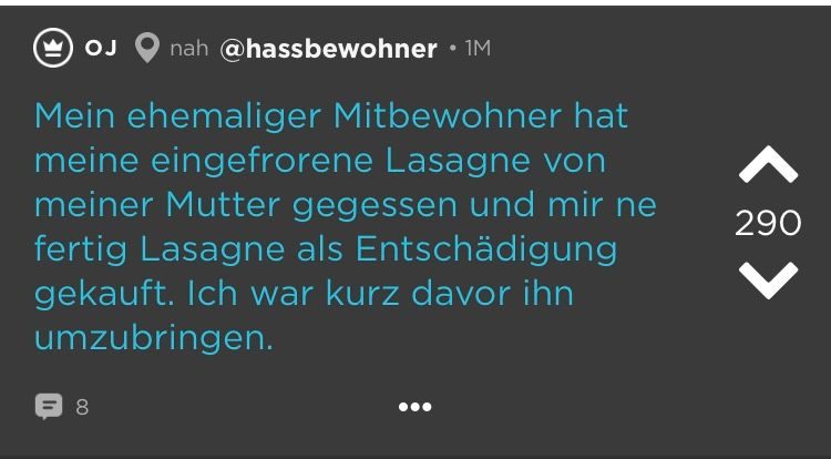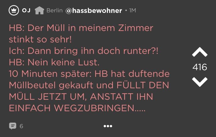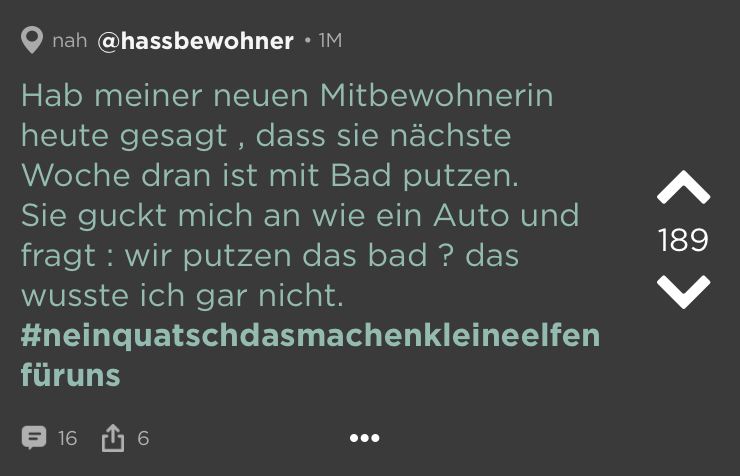 Kleine Zimmer, hohe Preise = WGs in deutschen Großstädten. Das ist schon ziemlich nervig. Und dann kommen auch noch diese Mitbewohner dazu! Schmutziges Geschirr, nicht eingehaltene Putzpläne, fremde Haaren im Bad (Lüge, die sind überall). Aber wir waren jung und brauchten das Geld oder irgendwie so. Die besten Ankedoten über schräge WG-Castings, Müllhorter & (beinahe) Küchenbrände haben wir bei Jodel gefunden: