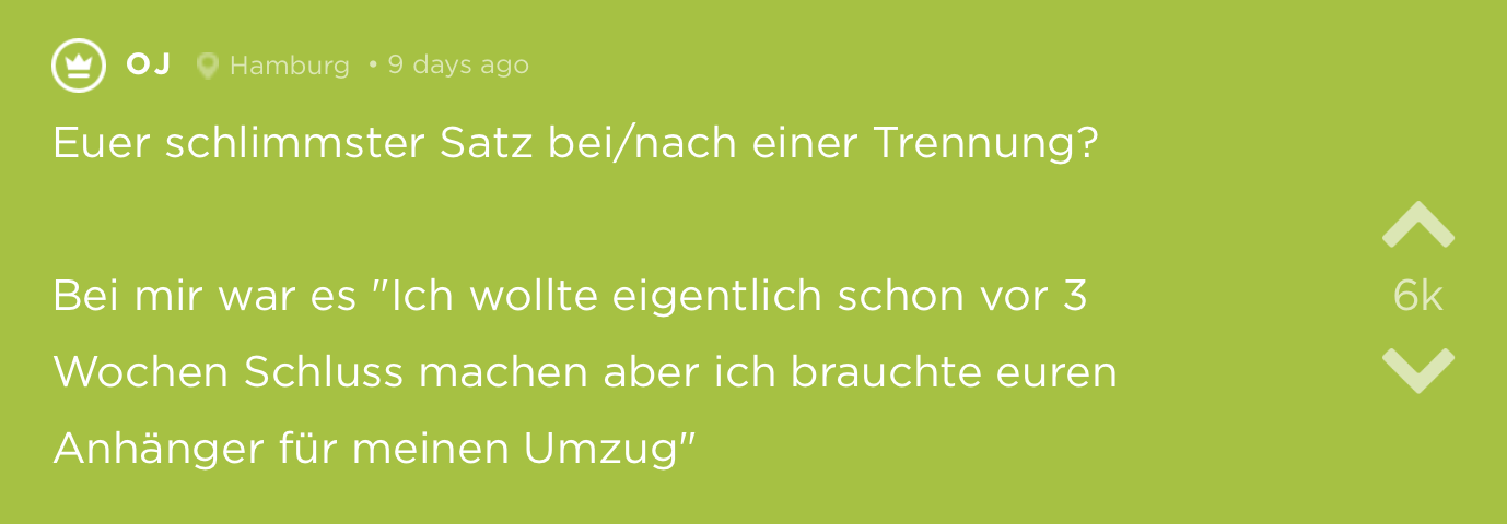 Trennungen sind nie schön. Meist für keinen der Beiden. Doch es gibt Aussagen oder Sätze, die eine Trennung noch viel schwieriger machen als sie eh schon ist. Die Jodel-Community scheint davon ein trauriges Lied singen zu können.