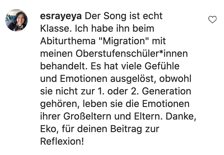 Ich hab ihren Song, und den Text, letztes Jahr in meinem deutschen Literaturkurs an der University of Pennsylvania benutzt. Es ging im Kurs über BPoC und die neuen Deutschen. Teşekkür ederiz.