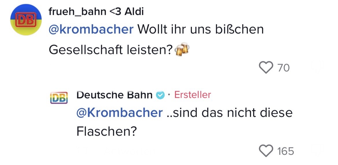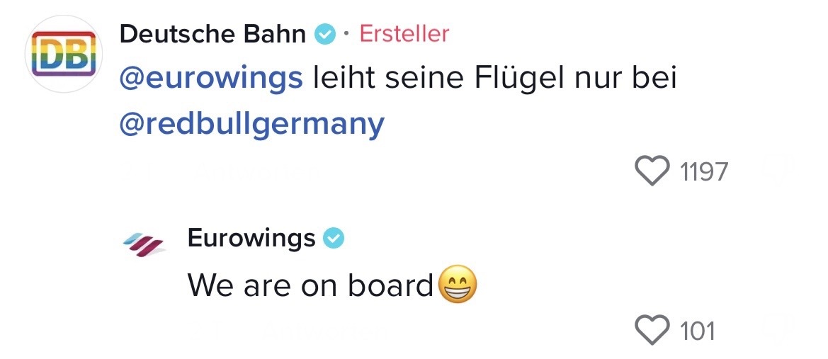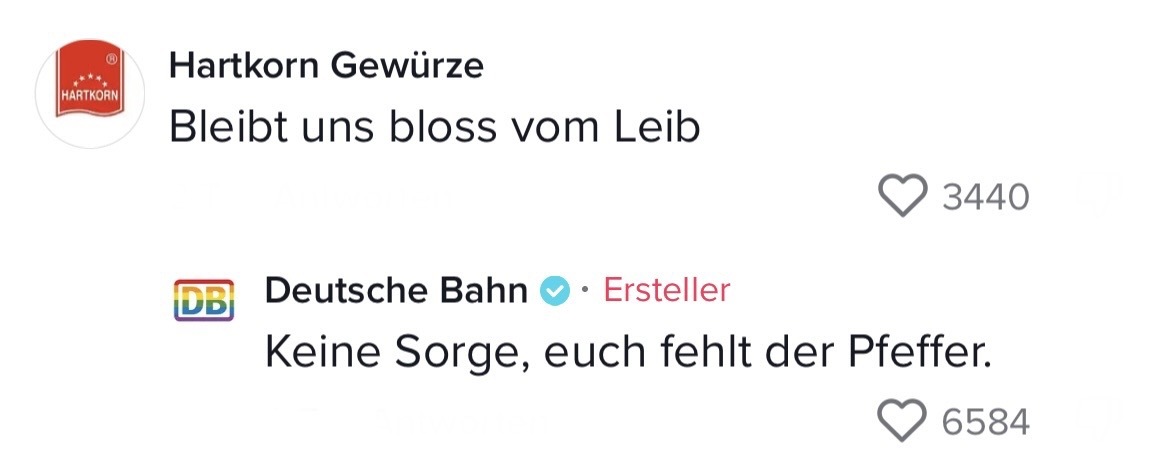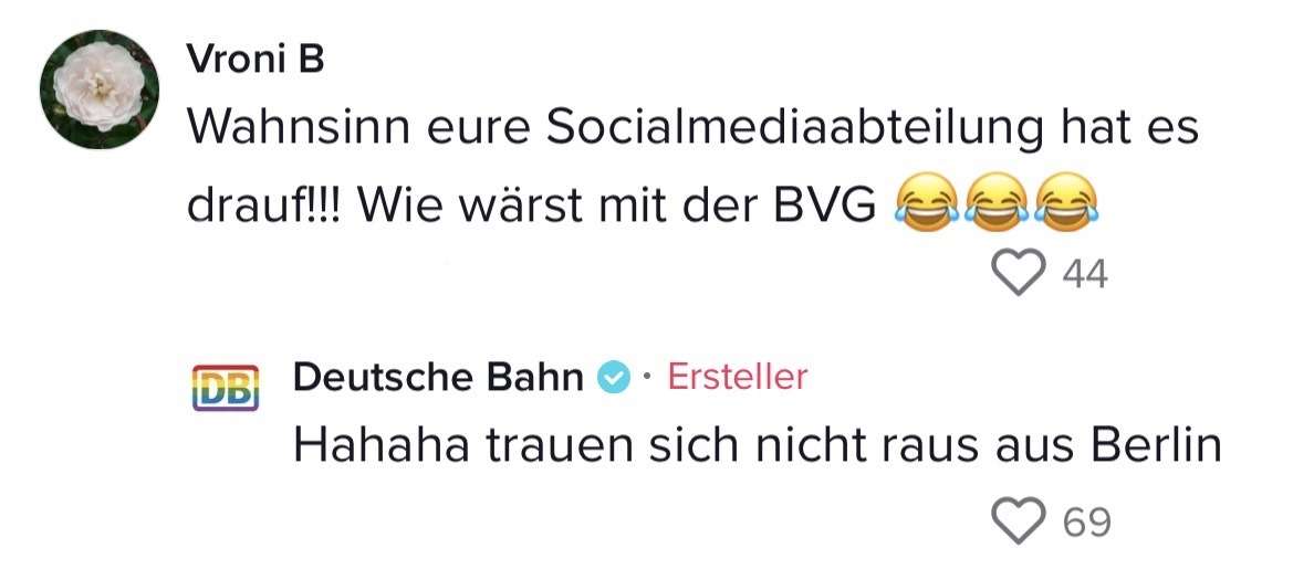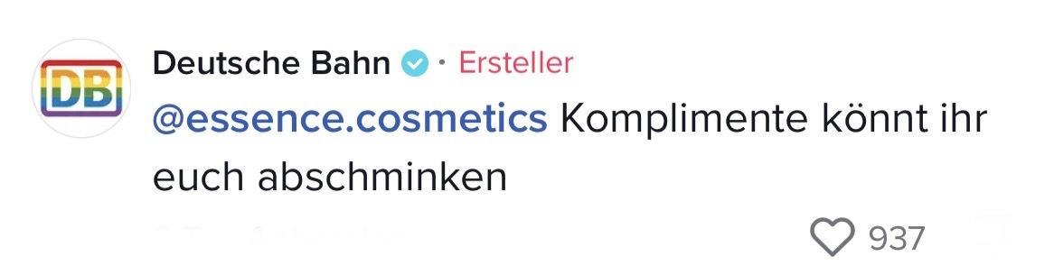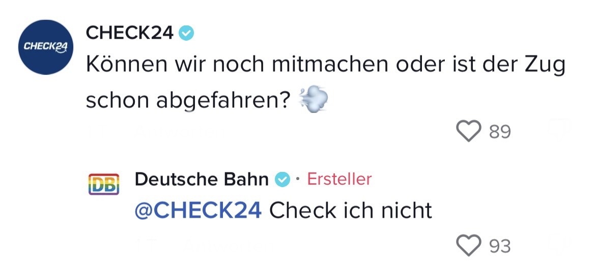Man muss mit dem Wandel der Zeit gehen. Das hat auch die Marketing-Abteilung der Deutschen Bahn verstanden. Die sorgten auf TikTok jetzt nämlich für ziemlich Unterhaltung. In ihrem Video riefen sie ihre Follower dazu auf, Marken zu nennen, mit denen sie einen Beef starten können. Prompt folgten die ersten Kommentare der Polizei Berlin, Eurowings und vielen anderen. Setzt euch hin, holt euch Popcorn und genießt die Kommentare. Denn die waren legendär! Die Bahn kommt zwar nicht pünktlich – roasten kann sie dafür allemal!