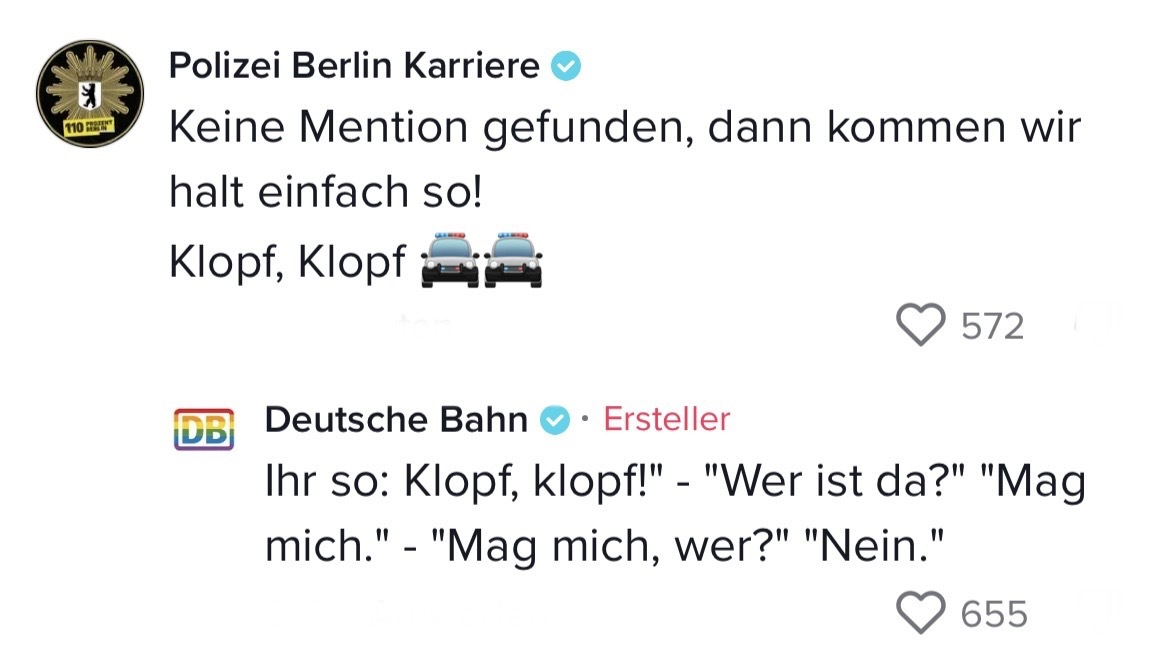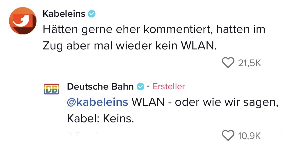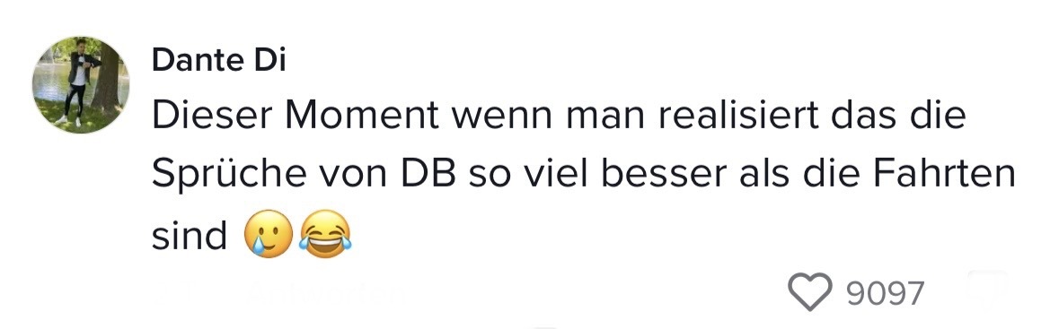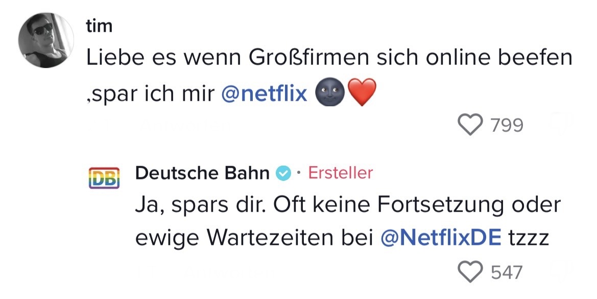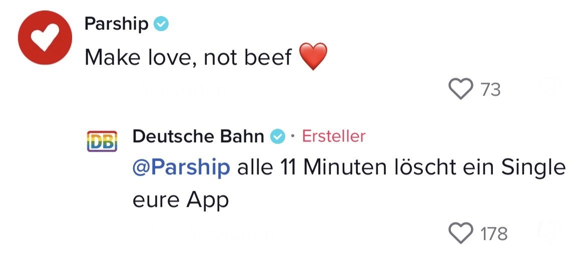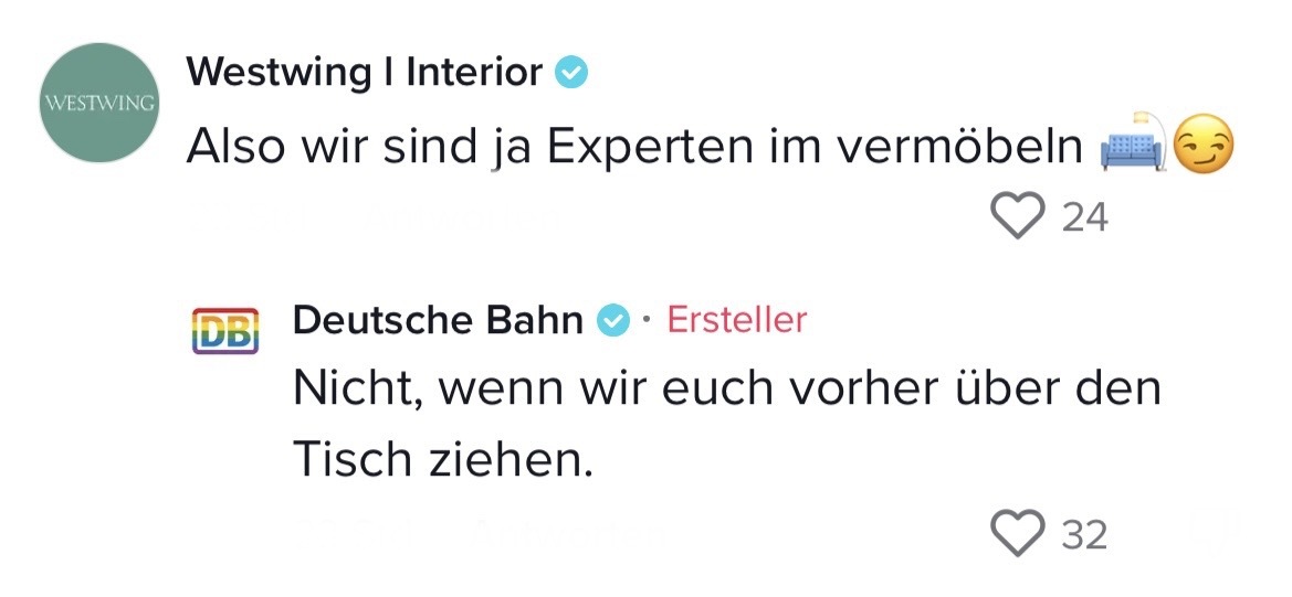 Man muss mit dem Wandel der Zeit gehen. Das hat auch die Marketing-Abteilung der Deutschen Bahn verstanden. Die sorgten auf TikTok jetzt nämlich für ziemlich Unterhaltung. In ihrem Video riefen sie ihre Follower dazu auf, Marken zu nennen, mit denen sie einen Beef starten können. Prompt folgten die ersten Kommentare der Polizei Berlin, Eurowings und vielen anderen. Setzt euch hin, holt euch Popcorn und genießt die Kommentare. Denn die waren legendär! Die Bahn kommt zwar nicht pünktlich – roasten kann sie dafür allemal!