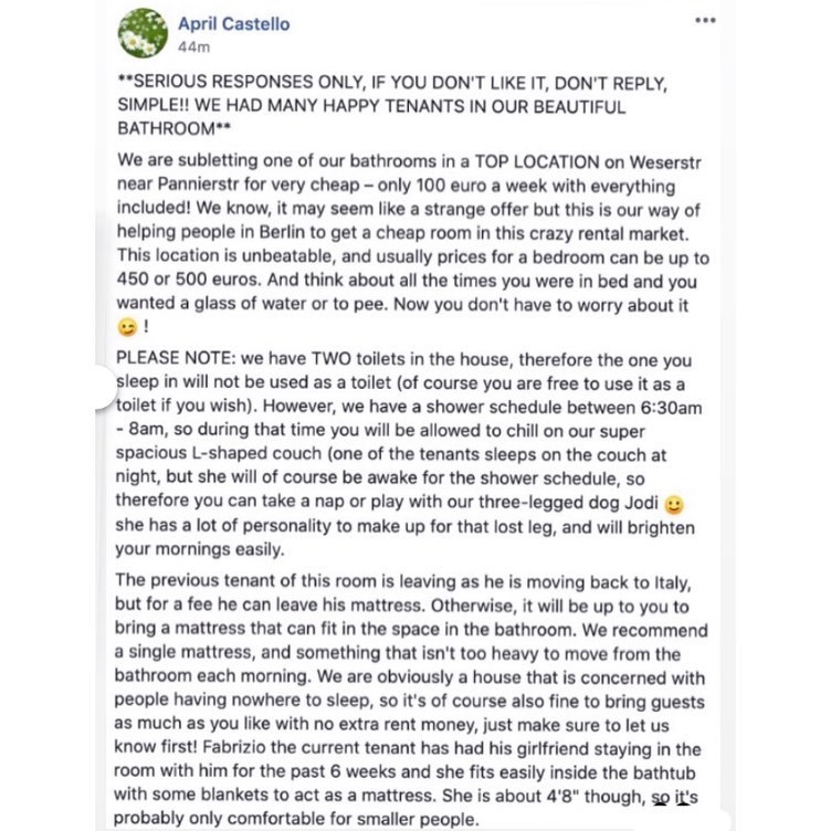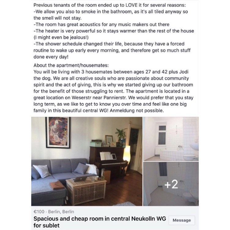 Der Instagram-Account Berlin Ausländer Memes postete ein Wohnungsangebot, das wohl nur mit Galgenhumor zu ertragen ist.
