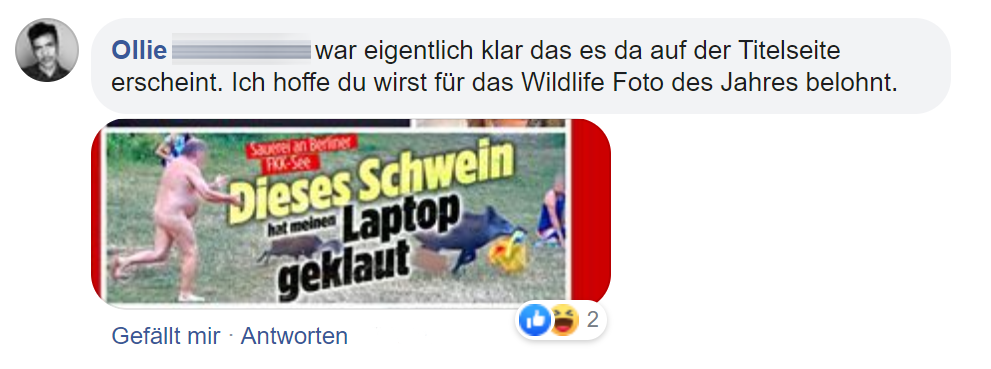 Ein Berliner See. Badegäste. Ein Wildschwein. Eine gelbe Tüte. Und ein nackter Mann. Das sind die Protagonisten eines Bildes, das innerhalb kürzester Zeit viral ging. Zum Hintergrund: Am Teufelsee in Berlin wurde die gelbe Tasche eines Mannes von einem Wildschwein geklaut. Da sich darin unter anderem sein Laptop befand, jagte der Mann natürlich hinterher. Doof nur, dass er in dem Moment keine Klamotten trug. Facebook-Userin Adele Landauer hielt den Moment in drei Bildern fest – mit der Einverständniserklärung des Betroffenen.
