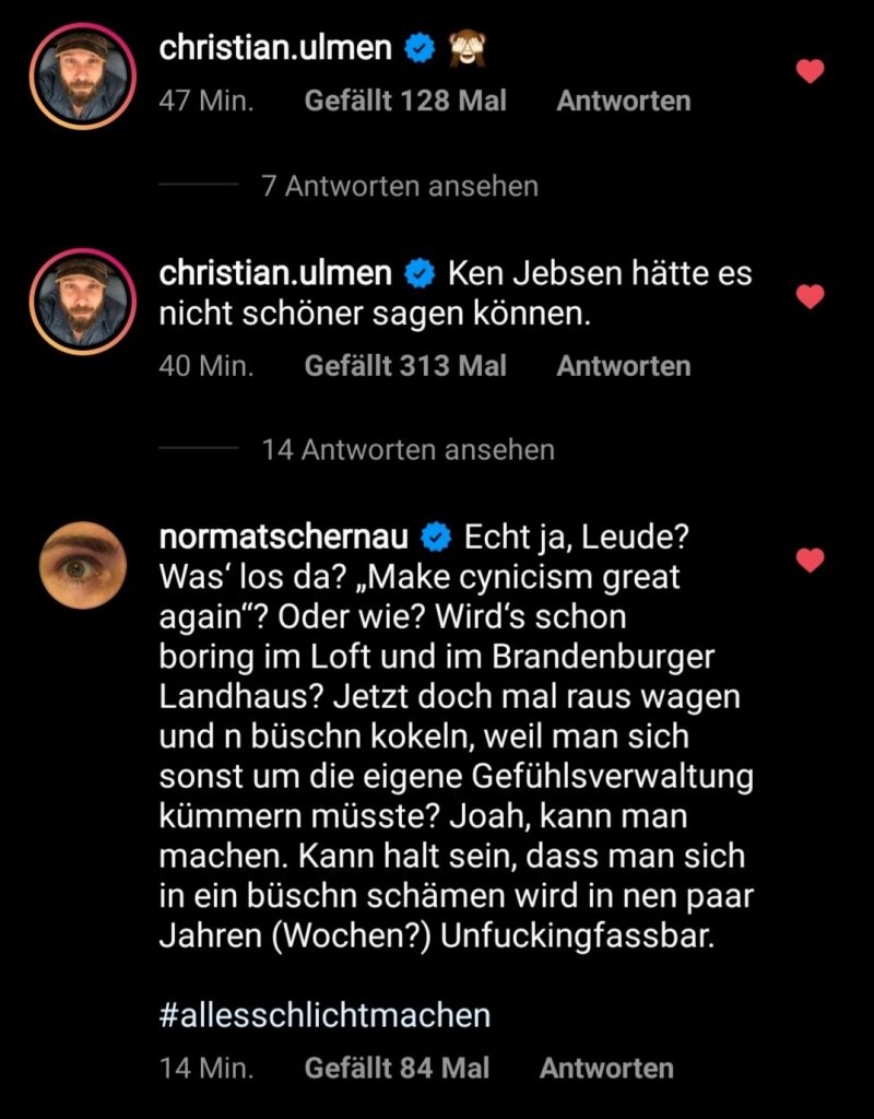 Elyas M’barek, Nora Tschirner und Christian Ulmen haben sich übrigens auch geäußert. Allerdings nur per Kommentar bei ihren Kollegen.