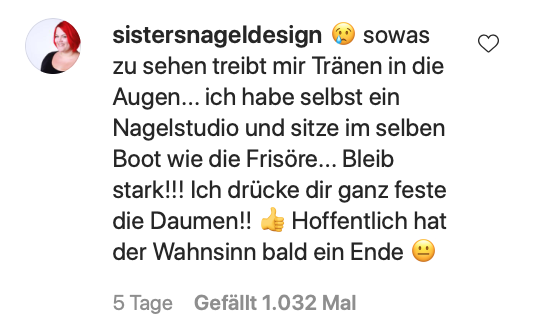 Corona grassiert seit mittlerweile über einem Jahr; am 27. Januar 2020 wurde der erste Fall in Deutschland bestätigt. Stießen die politischen Maßnahmen im Frühjahr während des ersten Lockdowns weitestgehend auf Zustimmung und Verständnis, mehren sich im aktuell zweiten Lockdown nun die kritischen Stimmen: die Maßnahmen seien nicht streng genug, z.B. in Bezug auf Homeoffice; Regeln und Ausnahmen seien mitunter inkonsequent und wenig nachvollziehbar, z.B. bei unterschiedlichen Regelungen in verschiedenen Bundesländern; die Verteilung der Hilfsgelder lässt zu wünschen übrig, so würden Großkonzerne mit Milliardenbeträgen gerettet, aber Schulen konnten für einem Bruchteil dessen nicht mit Luftfiltern ausgestattet werden. Auch mittelständische Unternehmen wie Restaurants, Friseure oder der Einzelhandel sind während des Lockdowns von der Existenznot bedroht und warten händeringend auf finanzielle Unterstützung. Die Friseurin Bianka Bergler gehört dazu und hat in einem hochemotionalem Instagram-Video ihrem Ärger und ihrem Frust Luft gemacht.
