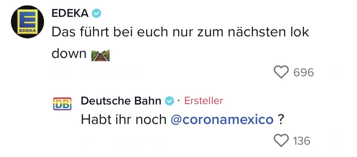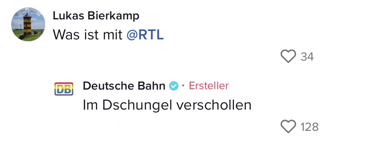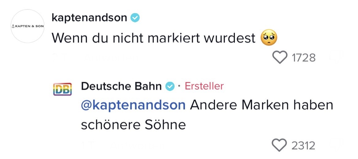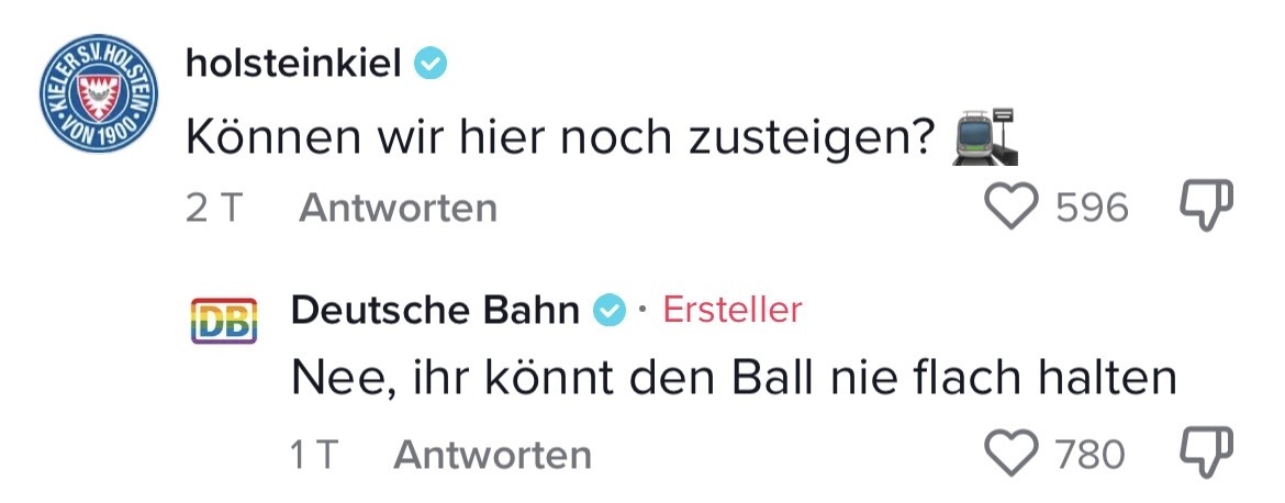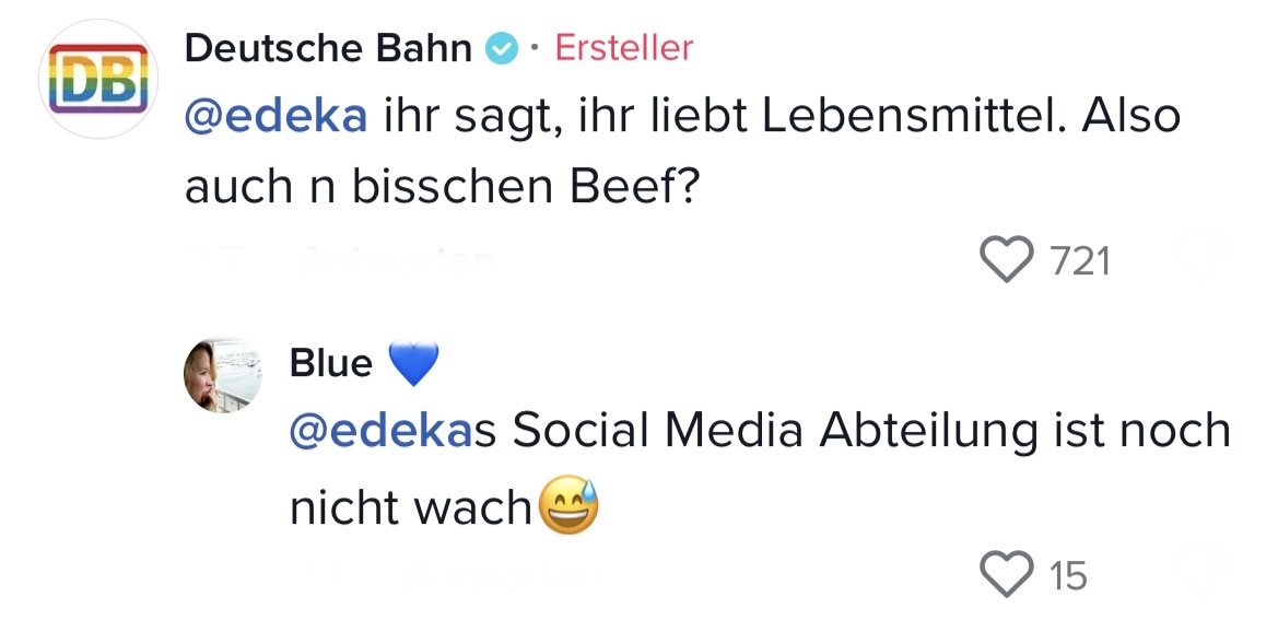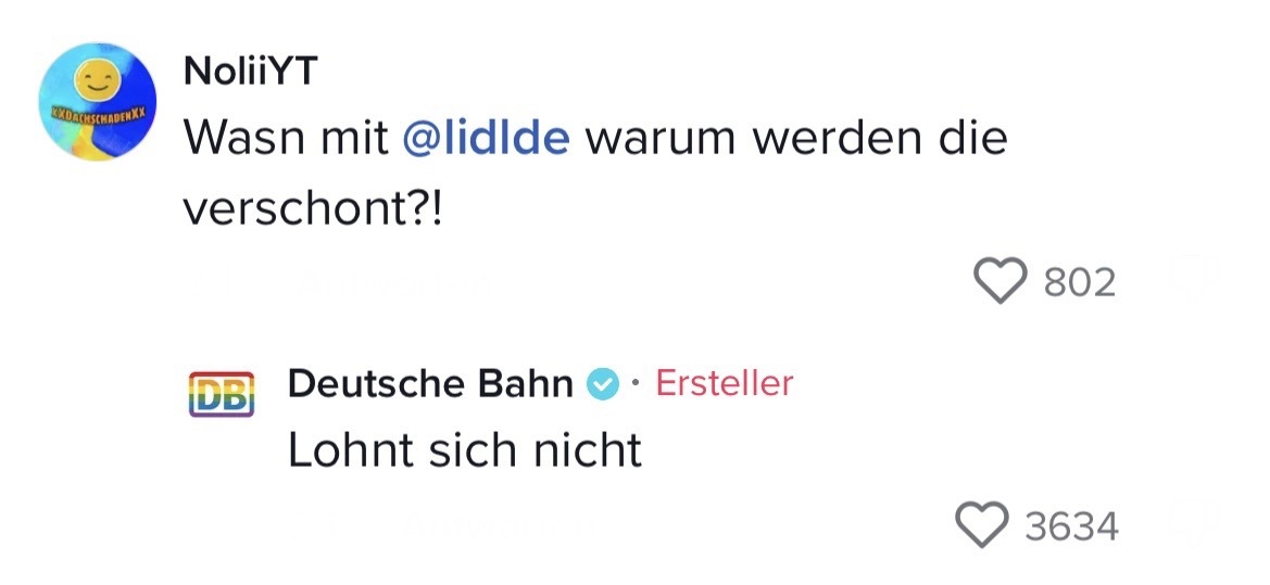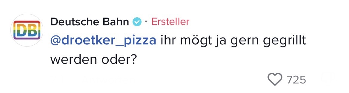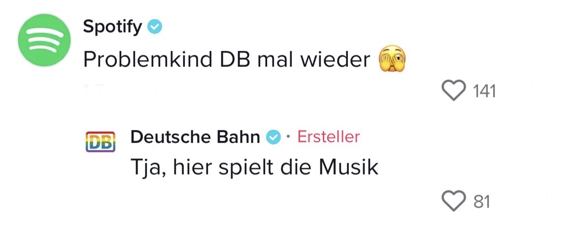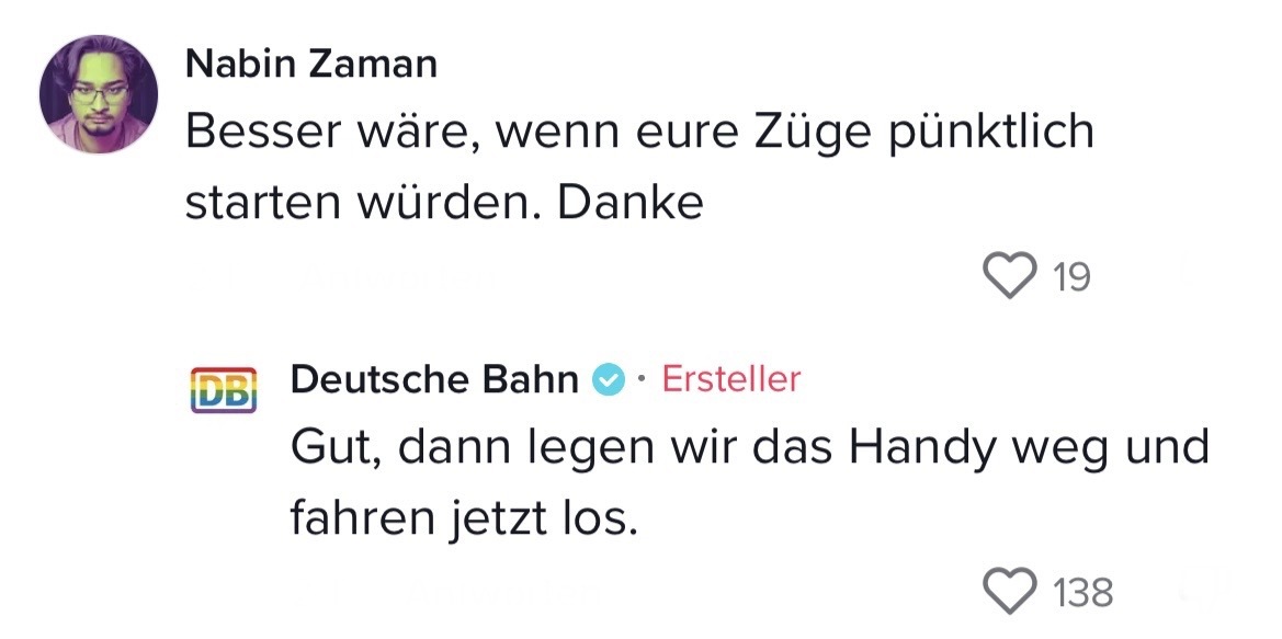 Man muss mit dem Wandel der Zeit gehen. Das hat auch die Marketing-Abteilung der Deutschen Bahn verstanden. Die sorgten auf TikTok jetzt nämlich für ziemlich Unterhaltung. In ihrem Video riefen sie ihre Follower dazu auf, Marken zu nennen, mit denen sie einen Beef starten können. Prompt folgten die ersten Kommentare der Polizei Berlin, Eurowings und vielen anderen. Setzt euch hin, holt euch Popcorn und genießt die Kommentare. Denn die waren legendär! Die Bahn kommt zwar nicht pünktlich – roasten kann sie dafür allemal!
