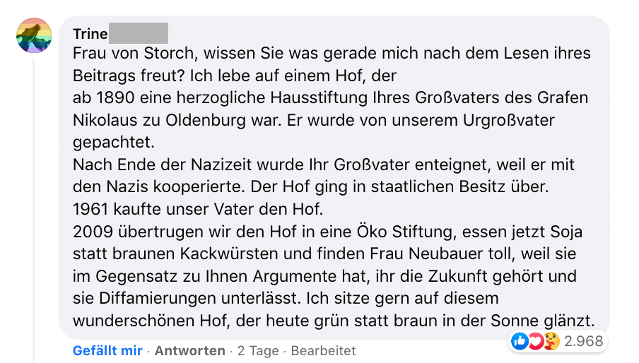 Auch einen Guten Morgen!☔️! Wie sagte Michele Obama: „If they go low….“!! Frau von Storch kann nichts für die Greueltaten der Nazis bzw. die Kollaboration ihres Opas. Aber sie hätte daraus lernen können. Auch was den Respekt vor engagierten Menschen und deren Meinung angeht.