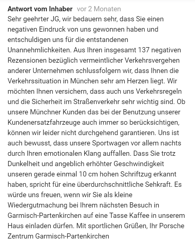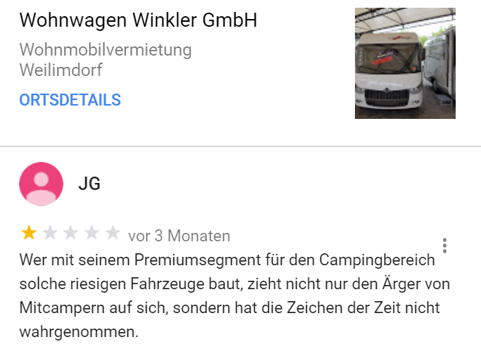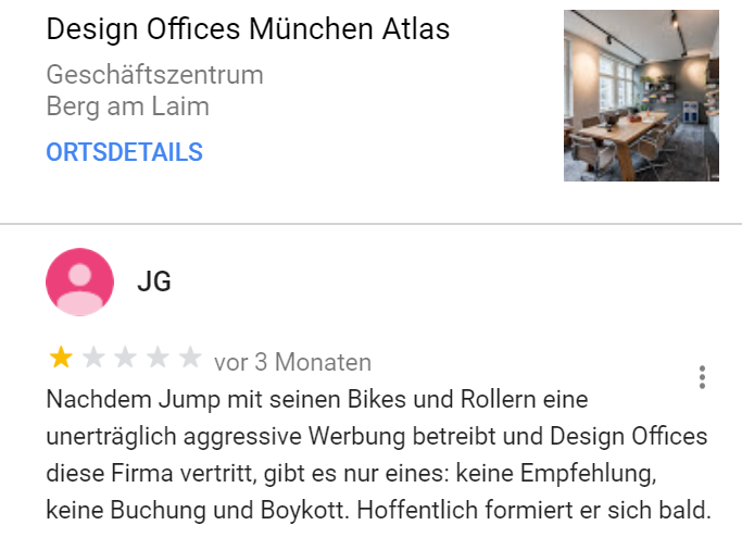 Deutscher wird es heute nicht mehr. Google-Rezensent JG führt einen Kleinkrieg gegen Unternehmen. Vor allem dann, wenn irgendwann irgendwo irgendjemand, der auch nur im Entferntesten mit dem Unternehmen zu tun hat, falsch geparkt hat. Oder zu schnell gefahren ist. Oder blöd geschaut hat? Es hagelt jedenfalls 1-Stern-Rezensionen. Mittlerweile 170 Stück. Tendenz? Steigend!
