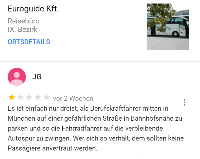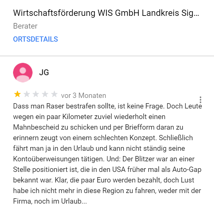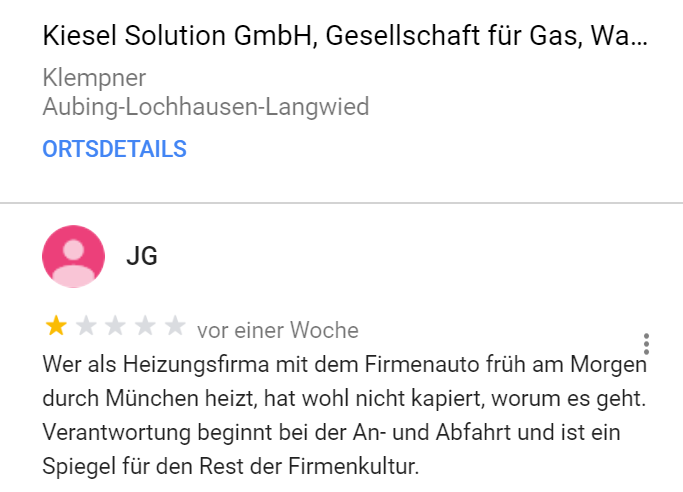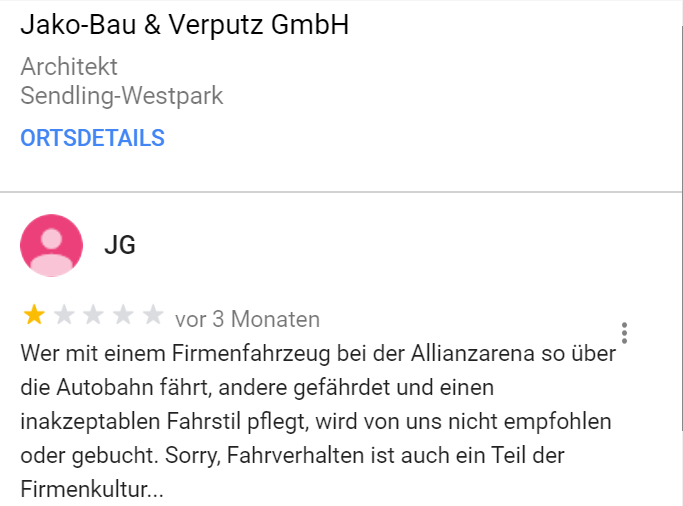 Deutscher wird es heute nicht mehr. Google-Rezensent JG führt einen Kleinkrieg gegen Unternehmen. Vor allem dann, wenn irgendwann irgendwo irgendjemand, der auch nur im Entferntesten mit dem Unternehmen zu tun hat, falsch geparkt hat. Oder zu schnell gefahren ist. Oder blöd geschaut hat? Es hagelt jedenfalls 1-Stern-Rezensionen. Mittlerweile 170 Stück. Tendenz? Steigend!