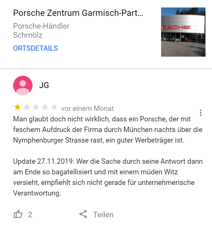 3. Wenn du auch nur ansatzweise unglücklich parkst, gibt es kein Erbarmen. JG findet dich, deine Freunde, dein Unternehmen und bewertet dich kacke auf Google.