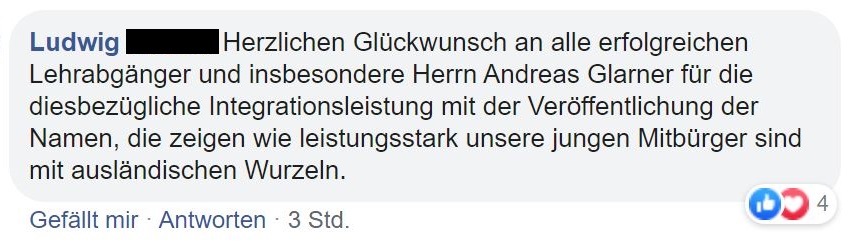 Auf Facebook postete Glarner nun ein Bild mit den Namen der Lehrabgänger bei ALDI in Perlen, einem Ort im Kanton Luzern. Offensichtlich waren ihm die Namen zu ausländisch. „Es ging mir darum aufzuzeigen, wie viele fremde Leute wir schon im Land haben“, sagte Glarner der Tageszeitung Blick.