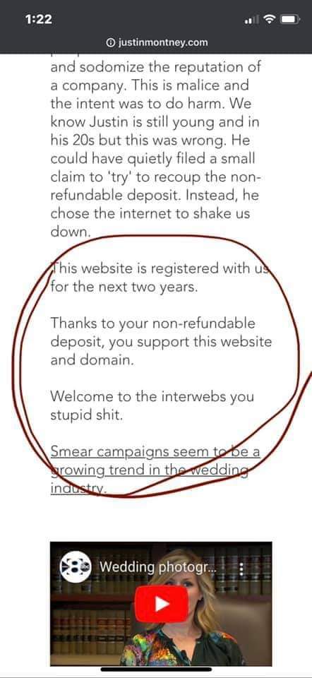 Der Hochzeitsfotograf kauft zusätzlich noch eine Domain mit dem Namen des Witwers und verlinkt auf dieser Social Media Profile von dessen Freunden und Familienmitgliedern. (Why?) Auf der Website gibt er an, „Sich dank der nicht zurückgezahlten Kaution für zwei Jahre die Domain leisten zu können“.