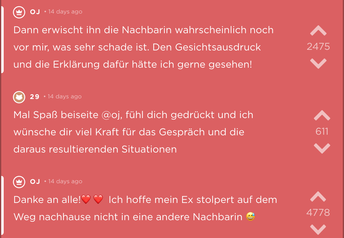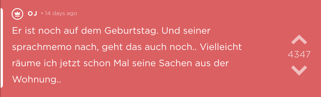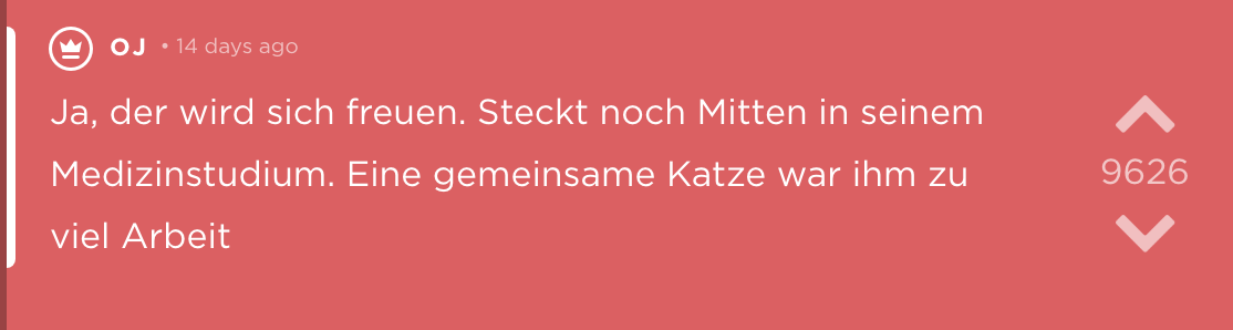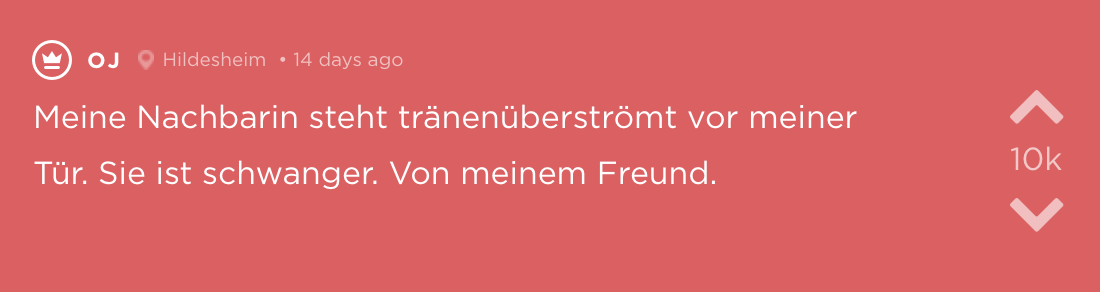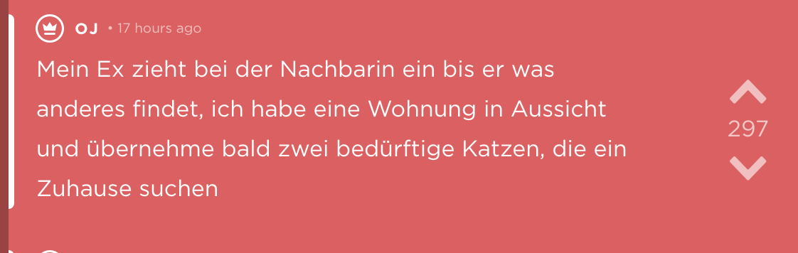 Sätze, die bei Trennungen fallen sind nie schön. „Schatz, ich hab die Nachbarin geschwängert“ gehört hier wohl auch dazu. Noch schlimmer ist allerdings, wenn man es von der Nachbarin selbst erfährt. Eine deutsche Studentin jodelt anonym diese Geschichte, bleibt im Angesicht dieses Ereignisses sehr cool und beweist (vielleicht ein wenig verdächtig guten) Humor. Zusätzlich liefert sie eine wichtige Erkenntnis: Hätte ich mir doch gleich eine Katze und keinen Freund geholt.