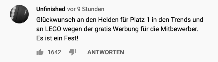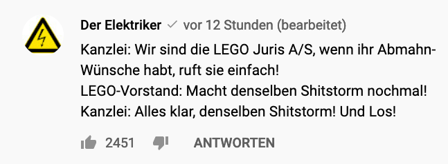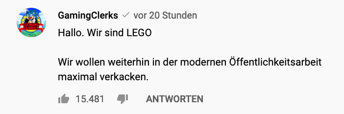 Sie könnten die Qualität ihrer Produkte verbessern oder sich an Wortmarken festklammern: Der Held der Steine nutzt die Gelegenheit, um daran zu erinnern, das Lego mit (selbstverschuldeten) Problemen zu kämpfen hat. Besagte Videos will er tatsächlich löschen und neu aufnehmen.