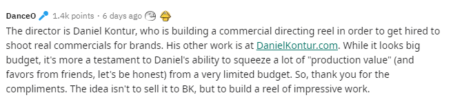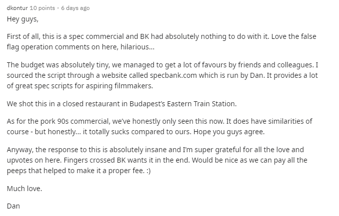 Früher, ganz, ganz früher gab es im Fernsehen Sendungen wie die lustigsten Werbespots der Welt. Diese Zeiten sind schon lange vorbei. Egal ob im TV oder auf YouTube, Werbung scheint nur noch lästig und nervig zu sein. Hände hoch, wer hier nicht gleich an Check24 oder Online-Casinos denkt. Man würde sich öfters intelligente und unterhaltsame Werbung wünschen. Dass das möglich ist, hat der Filmemacher Daniel Kontur bewiesen. Er hat einen inoffiziellen Burger-King-Spot gedreht, der auf Reddit viral ging.