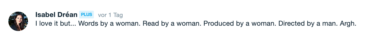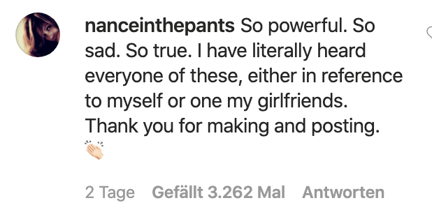 Aussagen, die Druck erzeugen und Probleme schaffen, aber quer durch alle Schichten täglich Frauen treffen, werden unter dem Deckmantel der gesellschaftlichen Erwartungshaltung akzeptiert, toleriert oder zumindest ignoriert. Gerade deshalb erhielt das Video ein beeindruckendes Community Echo. Es zeigt, wie groß die Erwartungshaltungen an Frauen sind, wie explizit die Vorstellungen darüber, wie eine Frau zu sein hat sind und wie sehr all das akzeptiert wird, völlig entgegen der freien Entfaltung, die jedem Menschen in einer offenen Gesellschaft zustehen muss. Dementsprechend wichtig ist der entstandene Diskurs über die Selbstbestimmung der Frau und den Einfluss, den nicht nur Männer, sondern generell die Gesellschaft, auf diese wichtige Freiheit hat.