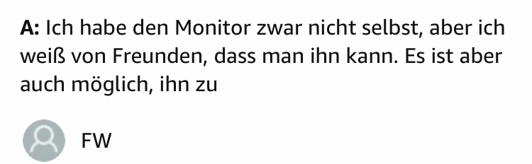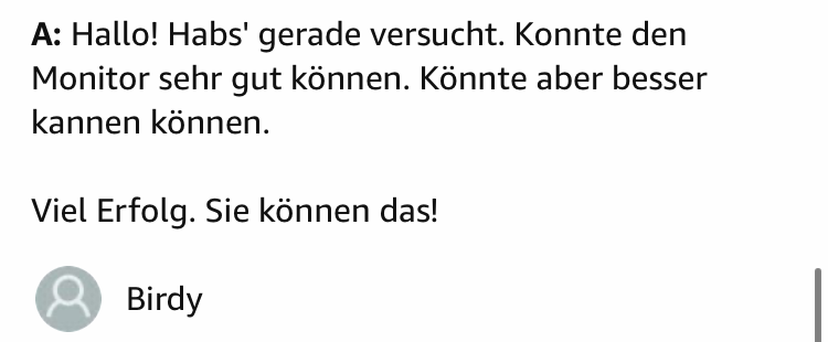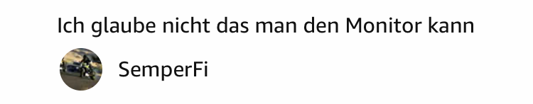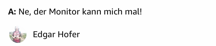 Watt muss so’n Monitor eigentlich drauf haben. Dinge anzeigen vielleicht. Gute Auflösung. Groß sein, blabla, dieser ganze Schnickschnack. Bei folgendem formschönen Modell auf Amazon stellt ein User jedoch die einzig wirklich relevante Frage.