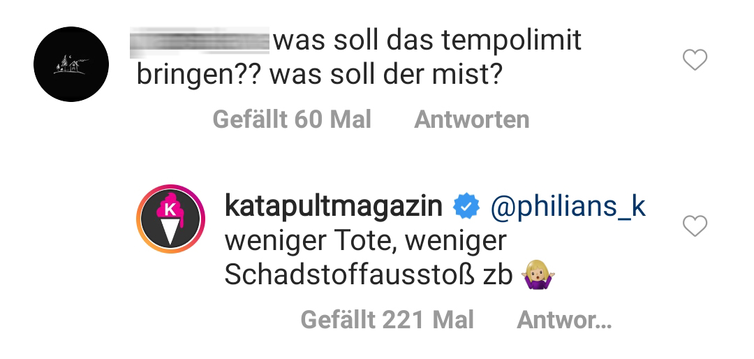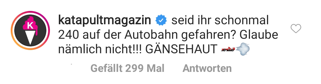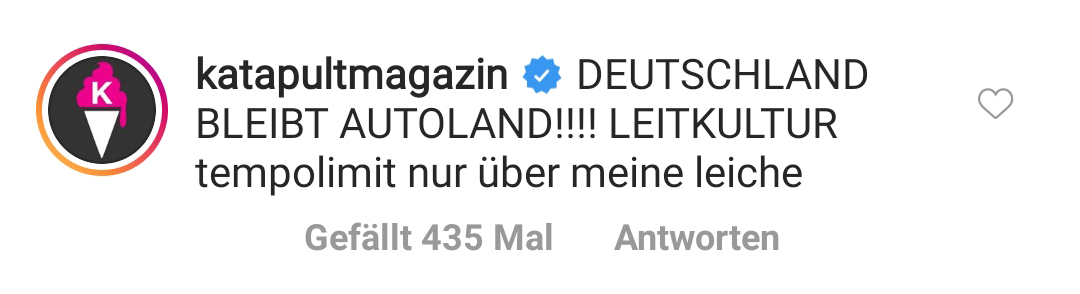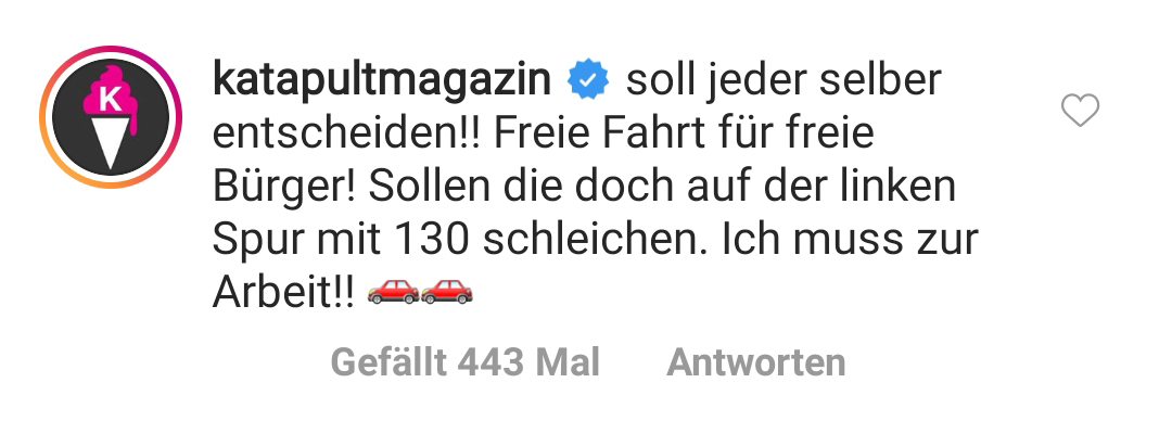 Ah ja, da wären wir wieder. Wohl kaum ein Thema spaltet Deutschland so sehr wie das Tempolimit. Okay, das war gelogen. So ziemlich jedes Thema spaltet Deutschland aktuell. Voll super. Warum sollten wir uns auch nicht einfach lieb haben? Wär ja viel zu harmonisch … Aber zurück zum Thema. Tempolimit. Da ist es eigentlich (wie so oft) völlig egal welche Fakten und Zahlen man aufbietet: Es folgen IMMER die gleichen Floskeln. Und die hat das Katapult Magazin bei einem Post zum Thema einfach direkt selber in die Kommentare gepackt. So als Vorsorgemaßnahme. Damit haben sie das System geschickt ausgetrickst. Denkste! Denn der wütende Mob der Tempolimit-Gegner lieferte trotzdem ab.