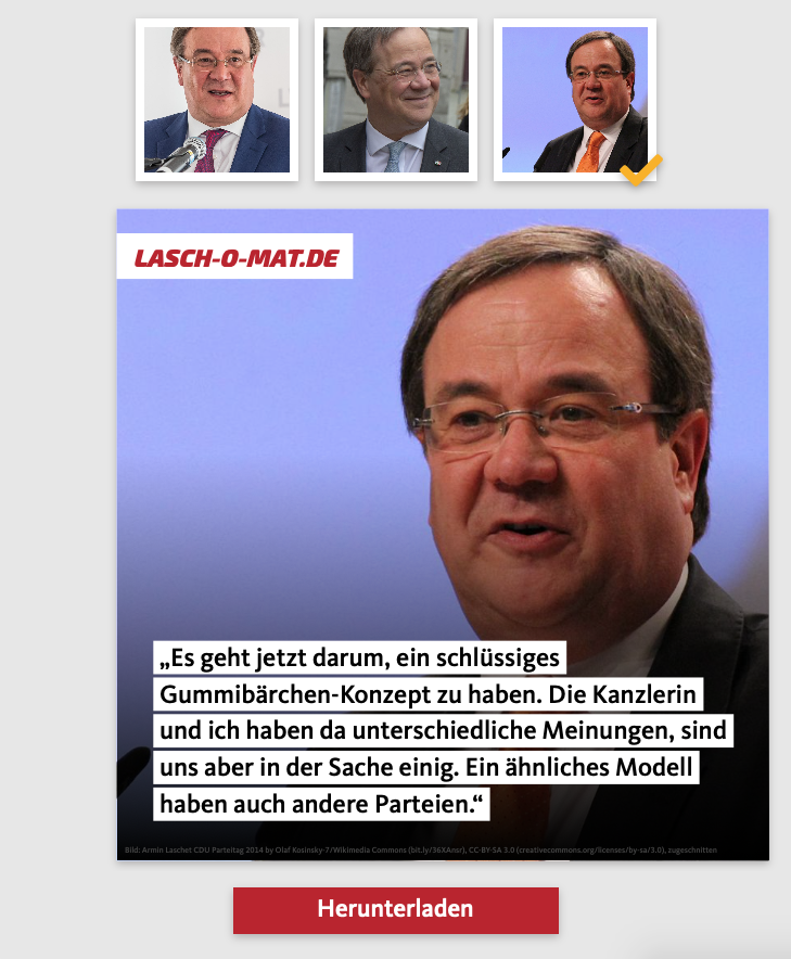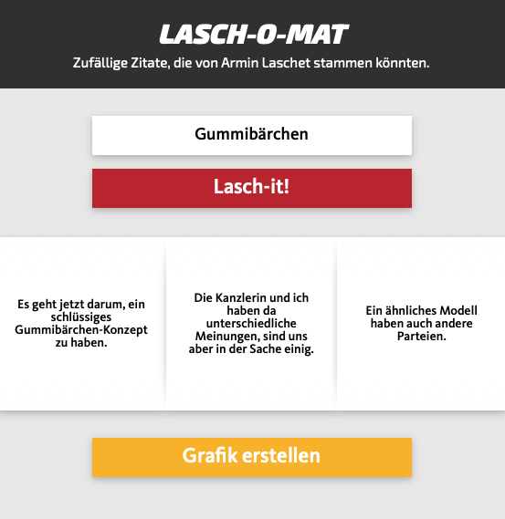 Fußballer und Politiker haben den Ruf, in Interviews mit leeren Phrasen um sich zu werfen; viel zu reden ohne etwas zu sagen. Wie generisch vor allem die Aussagen eines Armin Laschet mitunter sein können, illustriert nun der nigelnagelneue Lasch-o-mat auf amüsante Art und Weise. Unter lasch-o-mat.de kann man sich Laschet-Aussagen zu jedem x-beliebigen Thema erstellen lassen. Vom Original kaum zu unterscheiden!