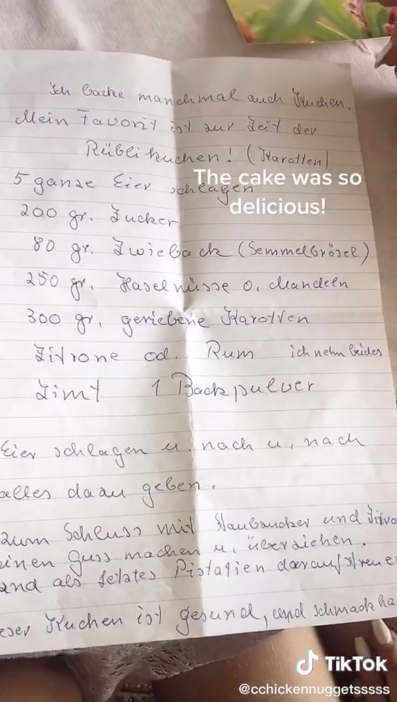 Bei nur einem Antwortbrief bleibt es allerdings nicht. Sieglinde teilt sogar ihr liebstes Kuchenrezept mit ihren neuen Brieffreundinnen, die es natürlich sofort nachbacken. Als Dank erhält sie einen langen Brief zurück, zusammen mit Fotos von dem Kuchen.