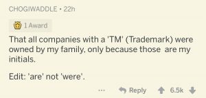 18. Alle Marken der Welt tragen dein Kürzel als Zusatz, läuft bei dir. Was kostet die Welt? Nichts, gehört mir ja schon alles.