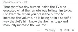 15. Die Vorstellung von dem kleinen Mann im Fernseher, der die Signale der Fernbedienung umsetzen muss, hatte ich früher auch.