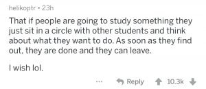 12. Eine Unze Wahrheit ist dabei: Studenten hocken im Hörsaal und überlegen, was sie machen wollen. Wer eine Lösung findet, hat bestanden und darf gehen.