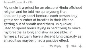 8. Wenn der verrückte Onkel, der in einer obskuren Hindu-Religionsform predigt, dir erzählt, du sollst keinen Sport machen, weil jedem Menschen nur eine bestimmte Anzahl an Atemzügen zustehen. Kein Wunder, dass heute niemand mehr nach draußen will.