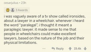 9. Das können wirklich nur englischsprachige Kinder falsch verstehen. Paralegal = Rechtsassistent/in, paraplegic lawyer = querschnittsgelähmter Rechtsanwalt. Die kindliche Schlussfolgerung aufgrund einer TV-Serie: Alle Juristen sitzen im Rollstuhl.