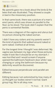 Und nun wieder zum eigentlichen Thema: Sexualkundebücher können verwirrend sein, wenn den Kiddies niemand das Gelesene erklärt und sie sich danach für unnatürlich halten.