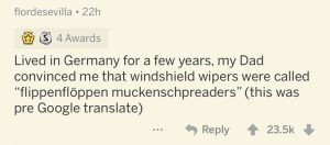 2. „Flippenflöppen Muckenschpreaders“. Eigentlich die viel schöne Bezeichnung für Scheibenwischer, geht direkt ins Ohr.