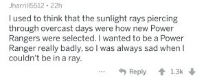 19. Wenn die Sonnenstrahlen an bewölkten Tagen die neuen Power Rangers auswählen würden, wäre ich längst der rote Ranger.