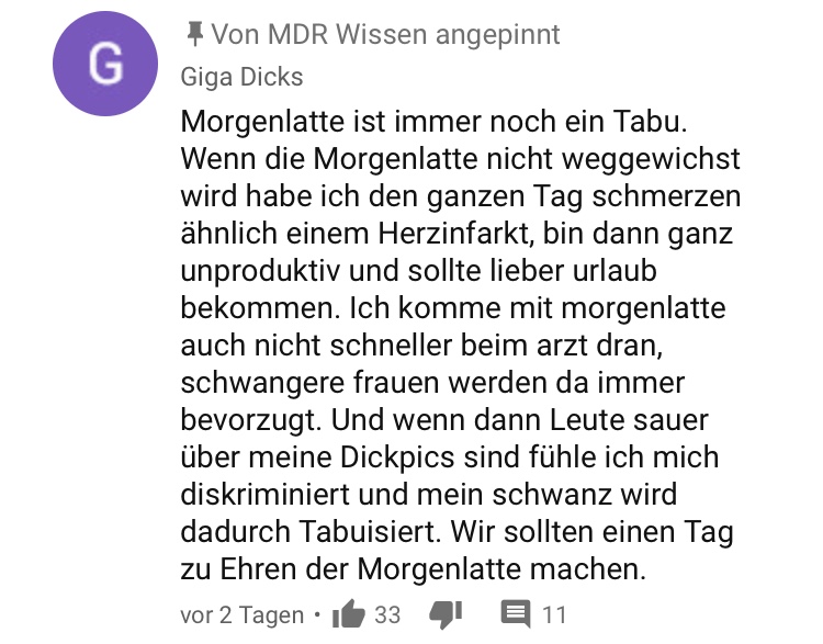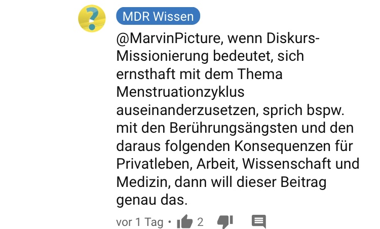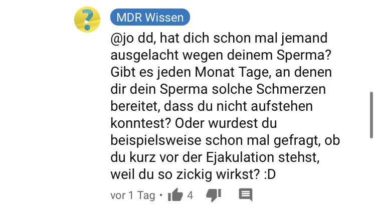 Dann stolpert man über ein Video und liest Kommentare wie „über mein Sperma redet niemand“ und merkt: Wir sind noch nicht fertig. Das Team von MDR reagiert gekonnt sachlich auf die (oftmals unpassenden) Kommentare und beeindruckt uns mit starkem Community Management.