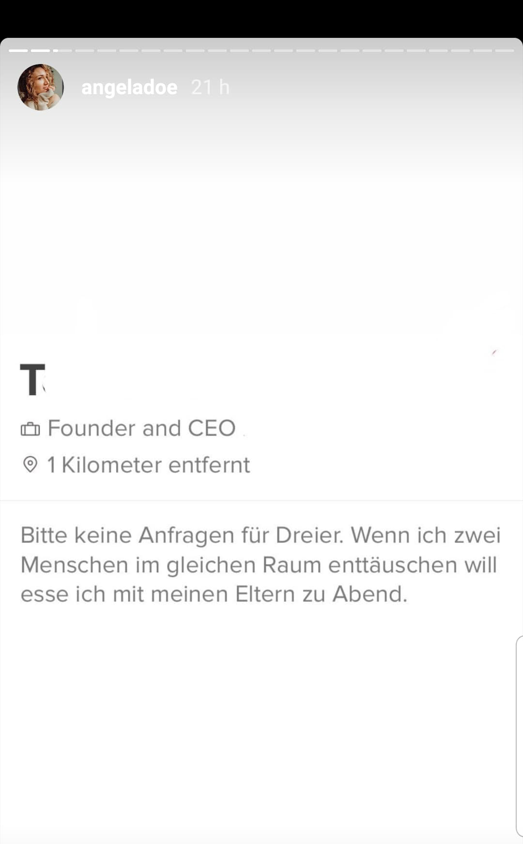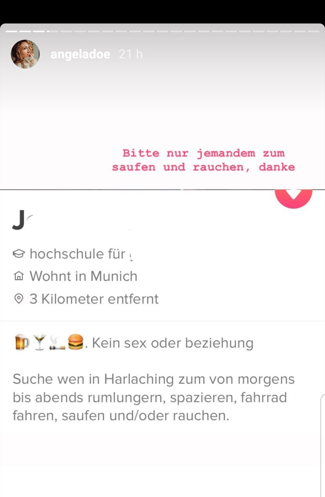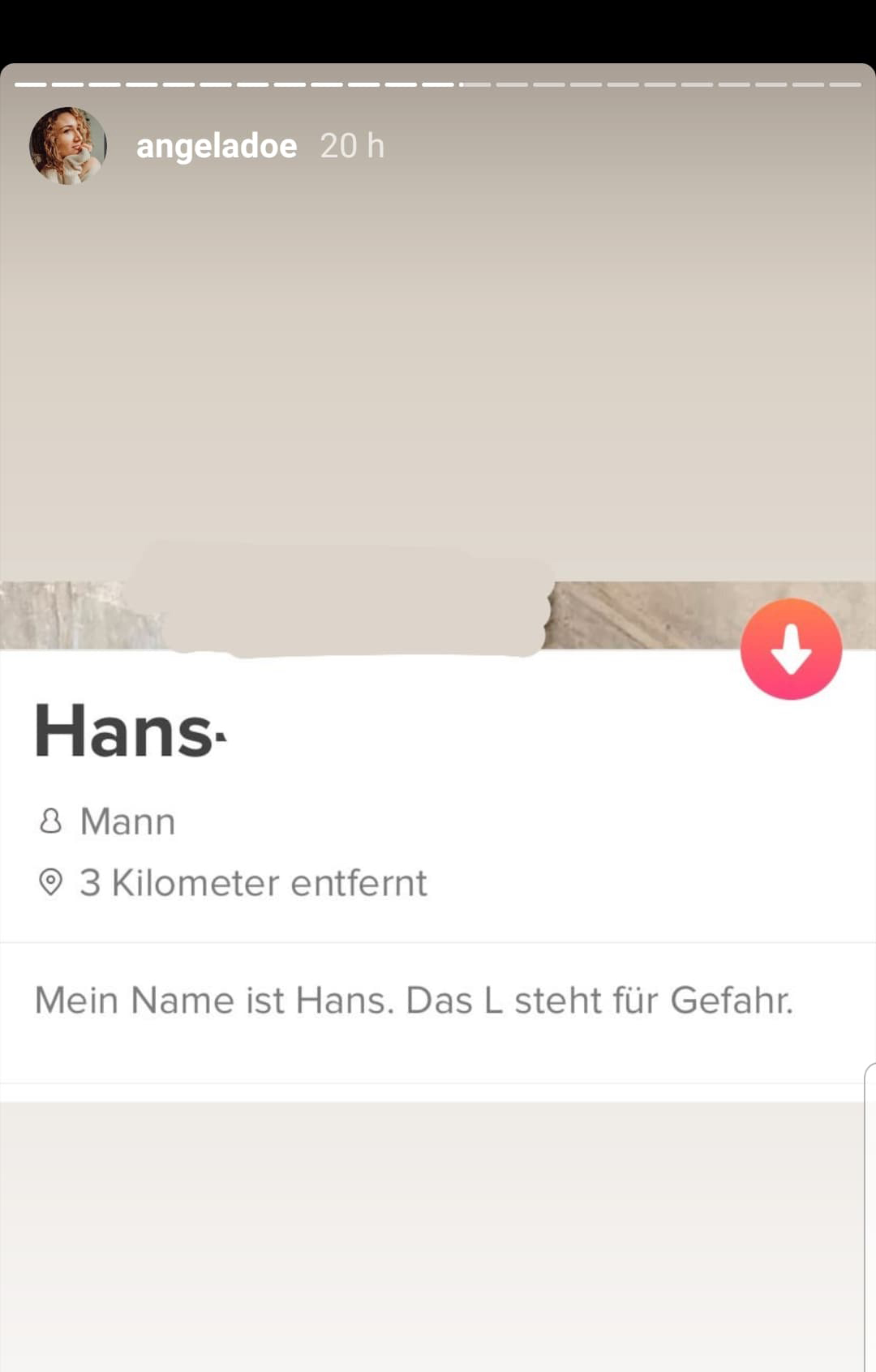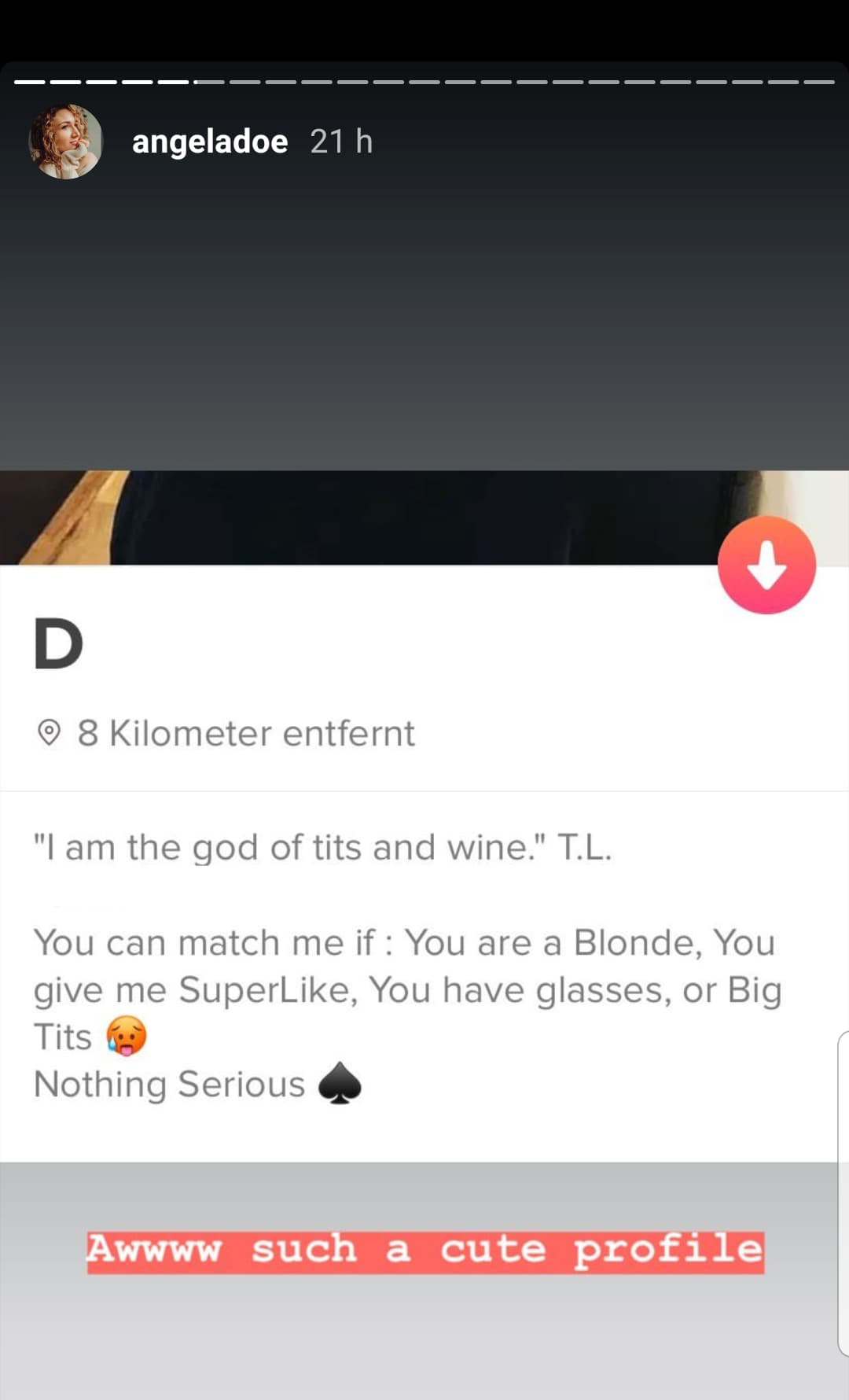 Tinder, Baby. Es ist wieder soweit. Bilder? Die sind doch sowas von oberflächlich. Da achtet doch heutzutage bei Tinder kaum noch jemand drauf. Nein, viel wichtiger ist die Biografie. Texte, die einem direkt aus der Seele sprechen. Texte so tief wie tausend Ozeane. So bezaubernd wie 100 David Copperfields. So inspirierend wie ein Blog bei The Best Social Media. Das sollte das Ziel sein. Mindestens! Das, oder die Penislänge. Die Münchnerin Angela Doe hat ihren Followern einen Einblick gegeben, auf welche Perlen sie dabei gestoßen ist.