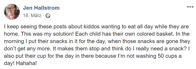 Jen hat noch ergänzt, dass das natürlich nicht alles ist, was ihre Kinder am Tag zu essen bekommen. Mit den Körben ging es ihr nur um die Snacks zwischen den Mahlzeiten.