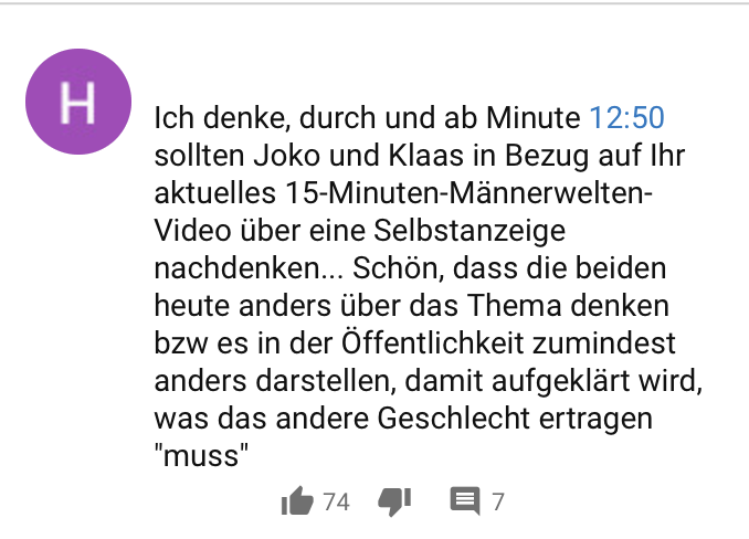 Der Beitrag Männerwelten von Joko und Klaas hat im Netz hohe Wellen geschlagen. Es entsteht massenmedial ein Diskurs über sexuelle Belästigung an Frauen und somit scheint das Ziel erreicht. Doch auch Kritik über einen fehlenden intersektionalen Ansatz und an der Zusammenarbeit mit Terre des Femmes (auch verantwortlich für die #unhatewoman Kampagne) kommen seit gestern vermehrt auf. Nun macht ein Video von NeoParadise aus dem Jahre 2012 die Runde. Klassischer Mitte 2010er Jahre „Wenn ich du wäre“-Challenge Content. In dem Video greift Joko einer Frau ungefragt auf Brust und Hintern, weil lustig (?). Die Minuten danach reiten sie sich noch weiter rein, mit Aussagen wie „Die geht jetzt sicher nach Hause unter die Dusche heulen“. Und ja, viele deutsche TV-Unterhaltungsformate hatten vor einigen Jahren noch einen anderen Zugang zum Thema Political Correctness und Satire. Aber auch das Zigeunerschnitzel war noch normal, genau wie Comedians mit sexistischen Putz- und Parkplatzwitzen zur Primetime. Die öffentliche Wahrnehmung von Political Correctness hat sich jedoch seit 2012 grundlegend geändert, und das ist gut so. Ein solcher Beitrag wäre von Joko und Klaas heute wohl nicht mehr denkbar, nichtsdestotrotz soll und darf es Raum für Kritik geben.