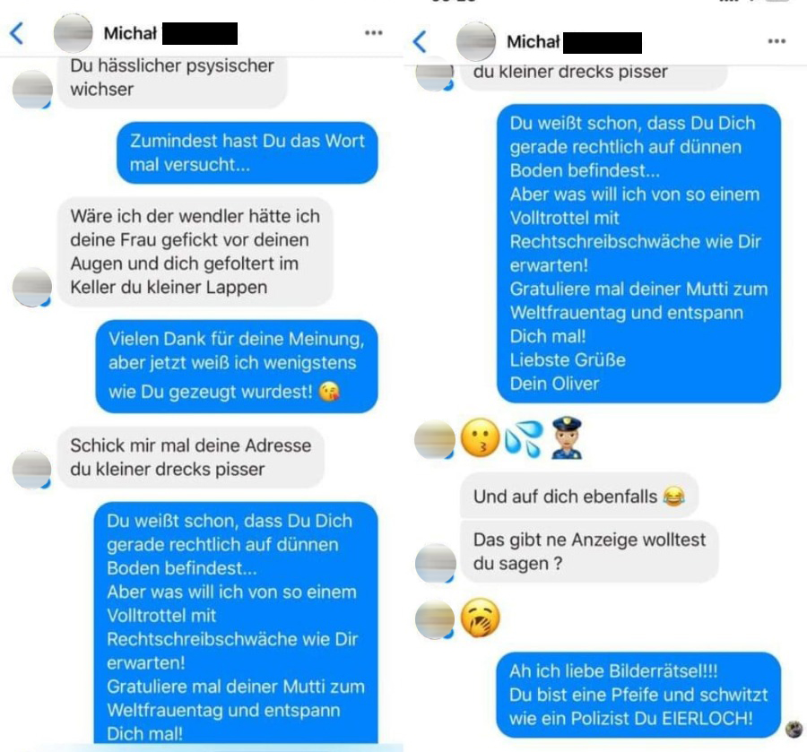 1. Derbe. Anstößig. Komplett unter der Gürtellinie. Diese Nachrichten erreichten Oliver Pocher via Facebook-Messenger. Er veröffentlichte sie mit Klarnamen (wir haben ihn geschwärzt). Löschte den Post nach dem Entschuldigungsschreiben aber wieder.