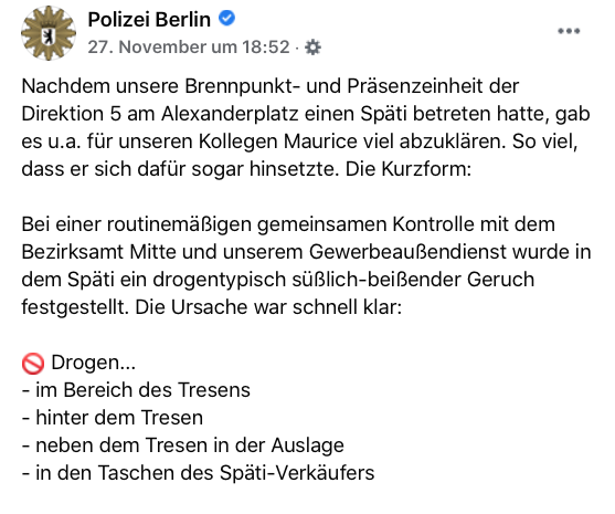 Wie sieht der Arbeitsalltag eines Polizisten aus? Was erlebt er auf der Straße? Man sieht so viele Darstellungen in Filmen, Serien oder Doku-Soaps, bei denen man sich fragt, ob so etwas in der Realität überhaupt möglich ist. Aber dann berichtet die Berliner Polizei auf Facebook über eine Razzia in einem Späti und man stellt wie so oft fest: Das Leben schreibt immer noch die besten Geschichten.