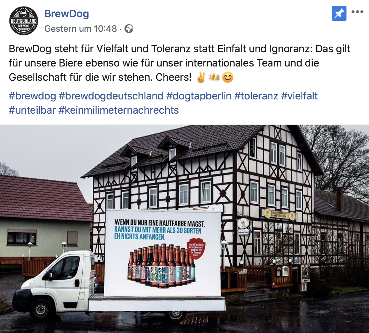 Vertrieben wird das „Reichsbräu“ vom ehemaligen NPD-Politiker Tommy Frenck, der im thüringischen Ort Kloster Veßra einen Gasthof betreibt. Im“Goldenen Löwen“ gibt es neben rechten Veranstaltungen auch schon mal „Hitlerschnitzel“ für 8,88 Euro. Die schottische Brauerei „Brewdog“ fuhr nun zufällig am Lokal von Frenck vorbei und zeigte dort Haltung mit einem starken Konter: