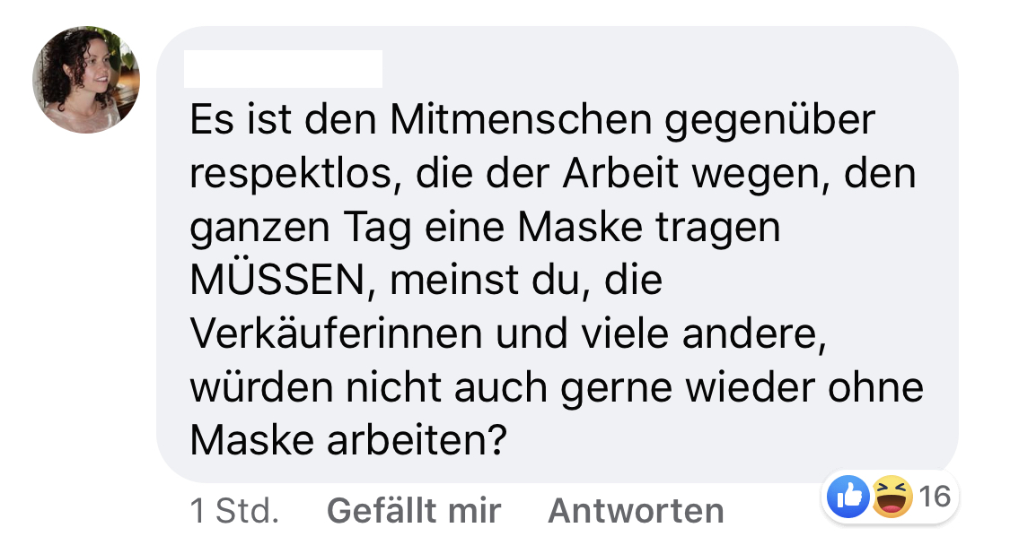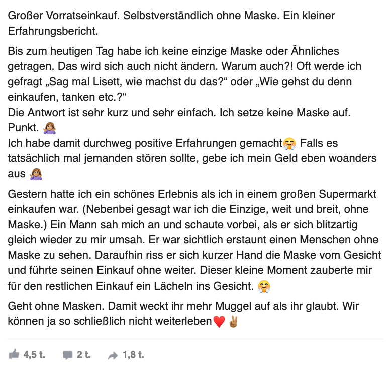 1. Facebook-Userin Lisett Braatz ist einer dieser Maskenverweigerer und postete einen Erfahrungsbericht aus ihrem derzeitigen Supermarkt-Alltag. Und der Beitrag sollte wenig verwundernd hohe Wellen schlagen.