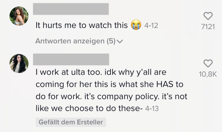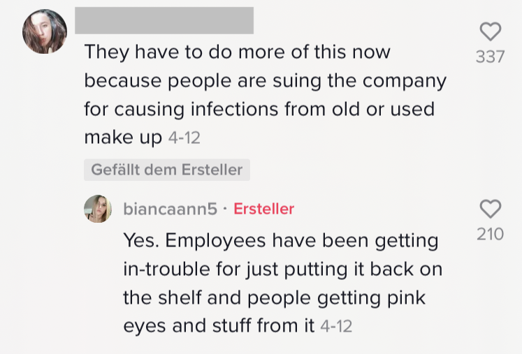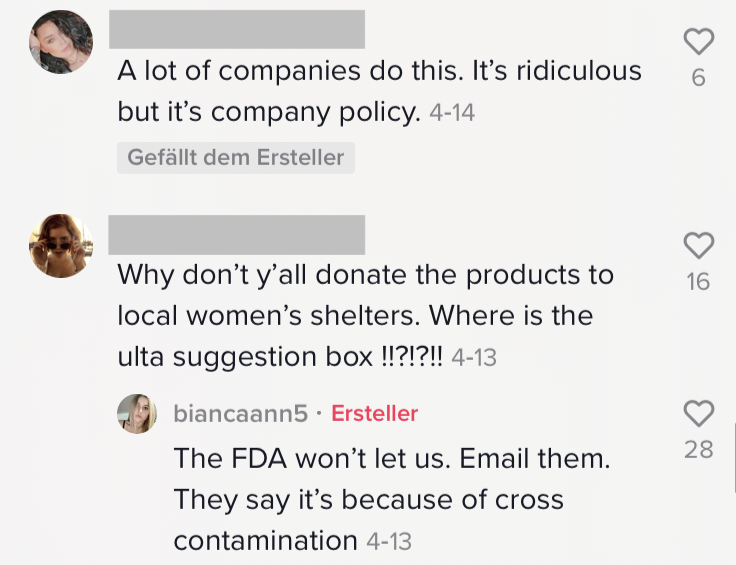 Die Falsche Farbe beim Make up erwischt? Impulskauf? Doch online günstiger gefunden? Die möglichen Gründe für Umtausch und Rückgabe sind unterschiedlich. Aber was passiert eigentlich mit den Produkten, wenn wir sie zurückgeben? Eine Angestellte der US-Amerikanischen Drogeriekette „Ulta Beauty“ gibt uns einen kleinen Einblick hinter die Kulissen. Das meiste wird nämlich zerstört und hinterher entsorgt. Nicht aus Boshaftigkeit oder Ignoranz des Unternehmens, sondern schlichtweg aufgrund der Hygieneauflagen. Nicht nur die Gefahr vor Kontamination mit Bakterien besteht, Produkte könnten nämlich im Worst-case auch mit giftigen Substanzen angereichert worden sein. Aus diesen Gründen stellt zum Beispiel auch eine Spende keine Lösung da. Die Angestellte wollte mit dem kurzen TikTok Video keineswegs ihren Arbeitgeber bloßstellen, sondern Kunden anhalten zu überlegen, bevor sie etwas impulsiv kaufen und später zurückgeben, so Bianca gegenüber Buzzfeed.