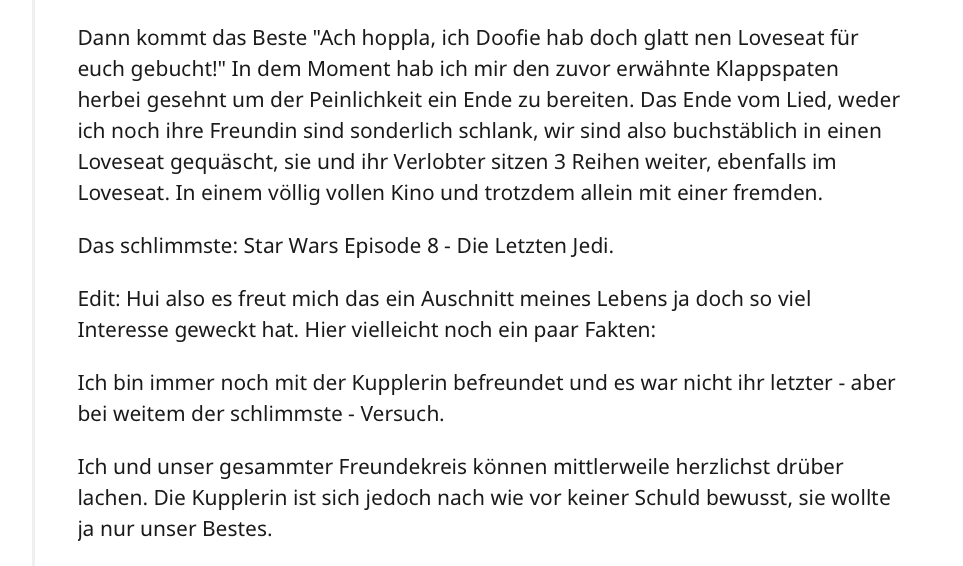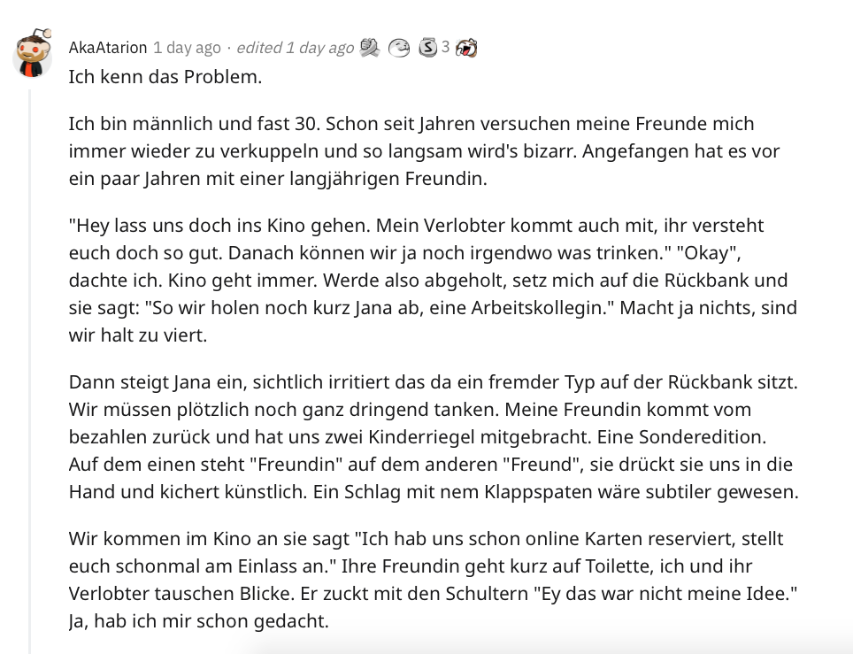 Ein User berichtete von seinen eigenen Erfahrungen mit peinlichen Verkupplungsversuchen, was in diesem Fall sogar ein besonders abschreckendes Beispiel war.
