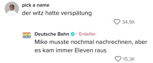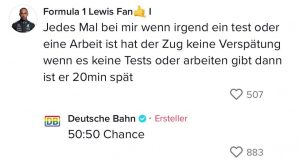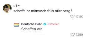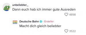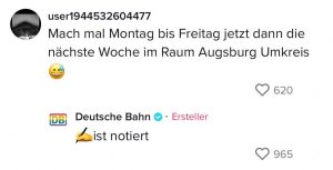 Wenn die deutsche Bahn eins drauf hat, dann Verspätungen. Immerhin wissen sie das und haben sich dieses Kennzeichen zur Marketingstrategie auf TikTok gemacht. Dort veräppeln sie sich in vielen Clips selbst. Selten erweisen sich ihre Verspätungen als nützlich, doch diese Schüler freuten sich über das unschlagbare Angebot der Bahn…