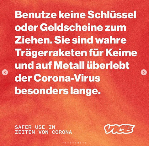Schulen schließen, Veranstaltungen werden abgesagt, Mitarbeiter flächendeckend nach Hause geschickt. Worauf ist in Zeiten von Corona überhaupt noch Verlass? Auf die Kollegen von VICE natürlich! Die pfeifen nämlich gewohntermaßen auf die Standard Hygienevorschriften, die uns derzeit jedes x-beliebige Nachrichtenmagazin um die frisch desinfizerten Ohren haut. Einfach nur Händewaschen? Soziale Kontakte meiden? Alles kaltes Keta, äh, kalter Kaffee. VICE zeigt euch, wie ihr auch während der Corona-Krise noch vernünftig ballern könnt. Auf Nummer sicher nämlich. Euer Office hat dicht gemacht? Nutzt die Zeit und macht euch selbst dicht!