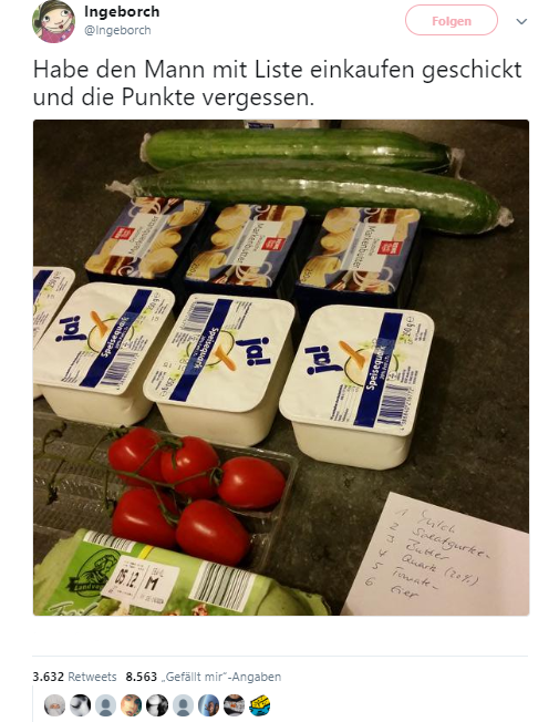 Einkaufsliste geschrieben, klare Anweisung gegeben, explizit ins Gewissen geredet … und zurück kommt er oder sie dann doch mit völlig anderen Dingen als die, die eigentlich hätten besorgt werden sollen. Oder die Hälfte wurde vergessen. Oder ist auf halbem Weg wo anders gelandet. Sie kennen das doch sicher auch. Den folgenden zwölf Twitter-Usern erging es nämlich exakt so …