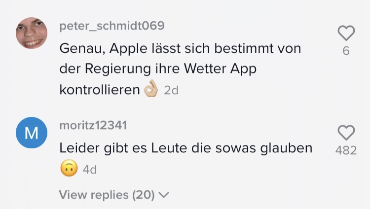 Als man vor ca. ner Woche einen Blick auf die handelsüblichen Wetter Apps geworfen hat, konnte einem das die ohnehin vermutlich ziemlich mittelmäßige Laune nochmal ziemlich verhageln – bzw. verregnen: In den meisten Regionen Deutschlands durchgehend hohe Regenwahrscheinlicheiten. Allein: Irgendwann ist einem aufgefallen, dass es irgendwie gar nicht so viel regnet. Juhu. Der Grund dafür ist meteorologisch erklärbar, warme Luftmassen aus dem Süden kämpfen mit kalten aus dem Norden, viele kleine Schauer, die schwer zu berechnen sind, die Wetter Apps zeigen daher vorsichtshalber erstmal immer Regen an. Aaaaber da wurde die Rechnung ohne unseren lieben Schwurbler gemacht! Vorgekaulter Regen?? Da hat doch die ReGiErUnG mal wieder ihre Finger im Spiel! Schließlich sollen wir doch zu Hause bleiben!!! Und bei Regen geht ja keiner raus!!!!!