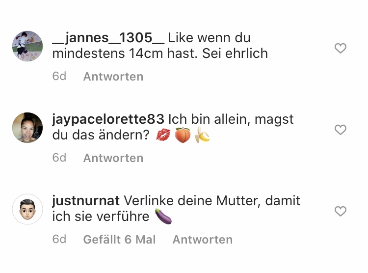 Wer auf Instagram unterwegs ist, kennt und liebt sie zu Genüge: Sexbots. Sie kommentieren seit Ewigkeiten schon fast jeden Post einer größeren Seite mit verheißungsvollen Angeboten à la „Hast du meine Unterwäsche gesehen?“, „Wer hat etwas langes und hartes?“, „Komm auf meine Seite, wenn du masturbieren willst!“, etc. Junggesellen hassen diesen Trick. Am Anfang sorgten diese Kommentare aufgrund ihrer seltsamen Formulierungen teilweise noch für Heiterkeit, inzwischen gehen sie einem sprichwörtlich nur noch auf den Sack.